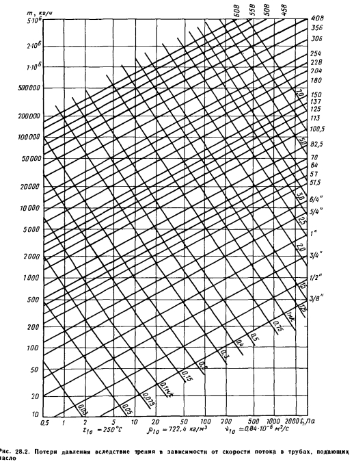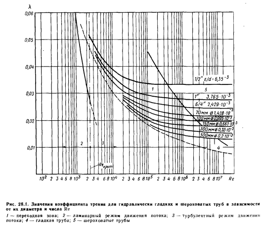 Потери давления при движении масла по трубамПотери давления вследствие трения описываются известной зависимостью (28.3), в то время как потери давления при преодолении местных сопротивлений (индекс г) — выражением ![]() Обозначения в формулах (28.1) — (28.5) общеизвестны. Значения коэффициента трения А при различных характерных режимах движения жидкости для гидравлически гладких и шероховатых труб в зависимости от их диаметра приведены на рис. 28.1. При построении этих кривых абсолютная шероховатость А принималась постоянной и равной 0,1 мм, т. е. характерной для труб небольшого диаметра. Поскольку свойства масла значительно изменяются в зависимости от температуры, кривые удельных потерь давления вследствие трения были разработаны для масла с температурой 250 ![]() ![]() При использовании масел с более низкой температурой это соотношение значительно возрастает, что объясняется значительным ростом кинематической вязкости v при снижении температуры. Так, например, при использовании масла с температурой / = 200°С Sio/Si«2,0—2,1, в то время как при температуре t = 20° С это соотношение равно 4,0—4,1. Для соотношения потерь давления на преодоление местных сопротивлений действительна зависимость ![]() Как выражение (28.8), так и (28.9) предполагают одинаковый массовый расход. Это одновременно позволяет сделать вывод, что при снижении температуры масла возрастают потери давления вследствие трения, а потери давления на преодоление местных сопротивлений снижаются. |