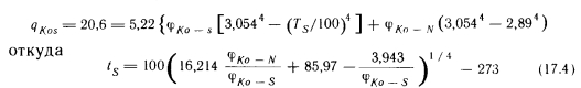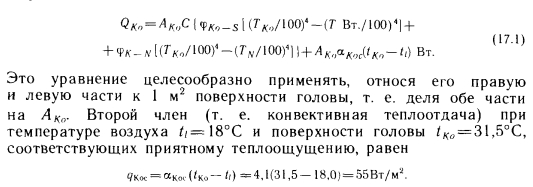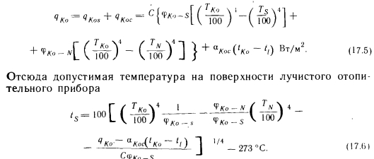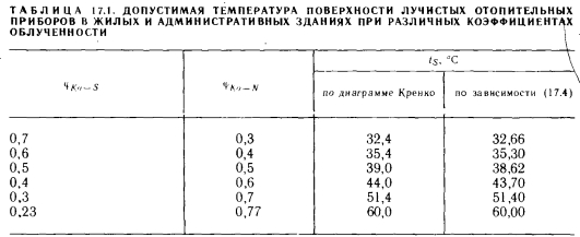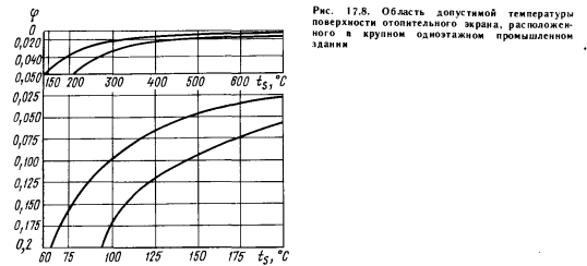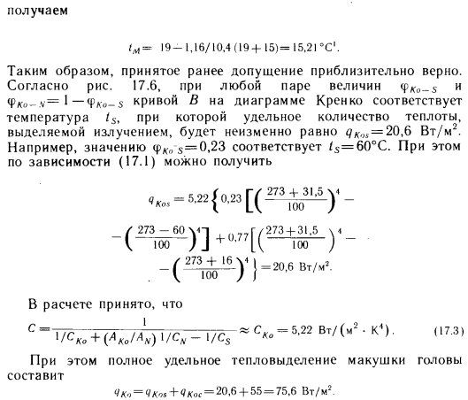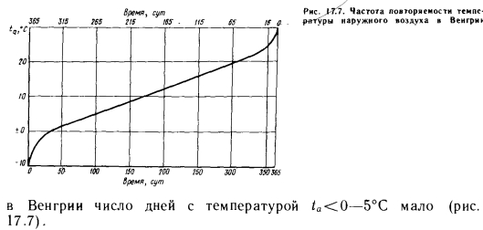 Применение метода Креико при меньших коэффициентах облученности (диаграмма Мачкаши)Диаграмма Кренко дает значения температуры поверхности отопительного прибора при коэффициенте облученности ср2з=0,2, т. е. для проектирования потолочного отопления жилых и административных зданий и лечебных учреждений. Необходимо отметить, что значения температуры поверхности отопительного прибора, благоприятные с точки зрения теплоощущения (кривая А), только в исключительных случаях обеспечивают одновременно и компенсацию теплопотерь помещений. Часто бывает недостаточна и температура, обеспечивающая допустимое теплоощущение (кривая В). В связи с этим большинство исследователей довольствуется тем, что получаемая по диаграмме температура может быть достаточна для покрытия теплопотерь до температуры наружного воздуха ta — 0 — 5°С, в то время как при более низкой температуре наружного воздуха приходится переходить за температурный уровень, соответствующий приятному теплоощущению. В подтверждение этого ссылаются на частоту повторяемости температуры наружного воздуха, несомненно доказывающую, что в Венгрии число дней с температурой <0—5°С мало (рис.17.7). Диаграмма Кренко дает очень мало исходных точек для применения греющих поверхностей с высокой температурой, поэтому необходимо было проверить, при какой температуре головы (индекс Ко) и каком тепловыделении данные диаграммы в пределах 90-5 = 0,7—0,2 обеспечивают тепловой баланс головы, и в соответствии с полученным уравнением теплового баланса дополнить диаграмму областью с коэффициентами облученности 0,2—0,001. ![]() Тепловой баланс макушки головы при применении лучистых отопительных приборов, расположенных над головой, может быть выражен зависимостью ![]() Для расчета лучистого теплообмена температуру необогреваемых поверхностей над плоскостью головы tn можно принять равной 16°С. К этим поверхностям (в помещениях с большими теплопотерями) относятся поверхности наружной стены и окна, а также поверхность потолка, считающаяся наружной. (Если бы эти поверхности не были наружными, то и теплопотери были бы меньше, и тогда необходимая температура греющей поверхности не превысила бы допустимую с точки зрения физиологии). Ниже приведен расчет температуры поверхности потолка при коэффициенте теплопередачи перекрытия k = 1,16 Вт/(м2-К) получаем ![]() Таким образом, принятое ранее допущение приблизительно верно. Согласно рис. 17.6, при любой паре величин кривой В на диаграмме Кренко соответствует температура ts, при которой удельное количество теплоты, выделяемой излучением, будет неизменно равно qKos = 20,6 Вт/м2. Например, значению фКо s=0,23 соответствует S=60°C. При этом по зависимости (17.1) можно получить ![]() Зная среднее лучистое тепловыделение макушки головы, обеспечивающее удовлетворительное самочувствие при температуре воздуха в помещении =18°С, допустимую при различных коэффициентах облученности ф/с0_5 температуру поверхности отопительных приборов можно установить, пользуясь уравнением ![]() Приведенное в табл. 17.1 сопоставление величин, получаемых в интервале 0,7—0,23 по зависимости 17.4 и диаграмме Крепко, доказывает возможность применения данной зависимости з указанном интервале значений коэффициентов облученности. ![]() Пользуясь зависимостью (17.4), можно определить и при меньших коэффициентах облученнос