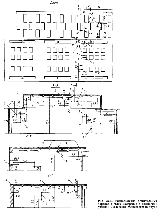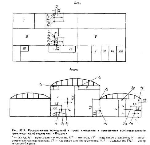 Производственные помещения учебной мастерской Министерства труда в БудапештеВ здании мастерских, состоящем из нескольких помещений павильонного типа, действует система лучистого отопления экранами, обогреваемыми паром. Замеры производились в помещении сборочного цеха второго курса высотой 7,50 м и в помещении сборочного цеха первого курса высотой 4,75 м (рис. 32.8). Помещение имеет железобетонное покрытие, расчетный коэффициент теплопередачи которого равен 1,6 Вт/(м -К). Зенитные фонари и боковые окна имеют стальные рамы и однослойное остекление. Внутренние теплопоступления в помещениях ничтожно малы, они составляют 2—3% суммарных теплопотерь. Размер отопительных экранов 1800 X 1800 мм, расстояние до резьбы отопительных труб 200 мм. Для теплоизоляции экранов применяется слой стекловаты толщиной 3 см. Отопление рассчитано на использование пара с давлением 0,02 МПа при 12-часовом периоде непрерывной работы. За время измерений рабочее давление обычно составляло 0,015 МПа, продолжительность непрерывной работы соответствовала расчетной. Замеры производились с помощью выверенных термогигрографов. Показания приборов контролировались ртутными термометрами, но температурные поля, формировавшиеся в среде, окружающей отопительные экраны, и температура в помещении ртутными термометрами не контролировались, поскольку при обследовании предыдущих помещений данные двух серий измерений отклонялись друг от друга незначительно. В данных помещениях предполагалось проконтролировать изменение температуры прежде всего в зависимости от высоты. В сборочном цехе второго курса замеры осуществлялись в 11 точках (см. рис.32.8). На основании приведенных измерений можно сделать следующие выводы. 1. Перепад температуры между рабочей зоной и пространством под покрытием здания составлял всего 1 — 3°С. 2. В рабочей зоне температура воздуха не опускалась ниже 10°С даже во время перерыва в течение 12 ч, хотя в данном помещении колебания внутренней температуры между периодом работы отопления и периодом его отключения были больше (8°С), чем в помещениях Северной базы ремонта транспортных средств венгерских государственных железных дорог. Это связано, во-первых, с тем, что данное помещение имеет меньший объем (больше удельное охлаждение), во-вторых, в помещениях Северной базы ремонта транспортных средств ночное охлаждение совпадало с периодом работы отопления, во время же перерыва наружная температура поднималась, в то время как в рассматриваемом случае условия были противоположными. ![]() ![]() В учебном цехе первого курса измерения производились в феврале также в 11 точках (см. рис. 32.8). В основном здесь получены те же результаты, что и в предыдущем случае, однако дополнительно были сделаны следующие выводы. 1. В рабочей зоне температура воздуха во время перерыва в работе в течение 32 ч не опускалась ниже 9° С, несмотря на наличие наружных стен и окон. Таким образом, отклонение по сравнению с температурой воздуха в полностью огражденном помещении учебного цеха второго курса составило лишь 1°С. 2. Влияние наружных стен и окон на температуру сказывается гораздо заметнее, чем, например, зенитных фонарей. 3. Температура воздуха непосредственно над отопительными экранами только на 4° С выше, чем средняя температура воздуха под чердачным пространством. |