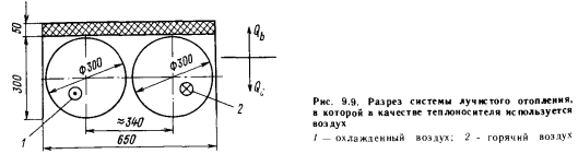 Расчет систем лучистого отопления, в которых в качестве теплоносителя используется воздухРасчет таких систем отопления отличается от расчета систем другого типа, что объясняется прежде всего конструктивными особенностями рассматриваемых систем. На рис. 9.9 показана система с двумя потоками (прямым и обратным), проходящими в воздуховодах диаметром 300 мм. Количество теплоты, поступающей вниз, можно вычислить таким же способом, как и для отопительных экранов, но с тем отличием, что температуру на излучающей поверхности следует принимать равной температуре теплоносителя. Как особый фактор при расчетах надо учитывать боковую теплопередачу через ограждающие листы, при этом следует принимать во внимание как лучистую, так и конвективную теплоотдачу. Теплопередачу через изоляционный слой (вверх) рассчитывают теми же методами, что и для отопительного экрана. ![]() Поскольку в Венгрии такое решение не применяется, приведем несколько технических характеристик системы «Radiant Tube». ![]() |