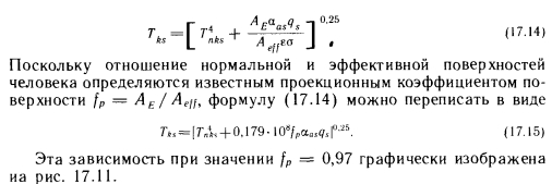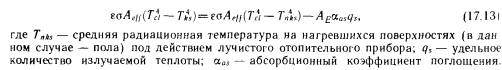 Расчет теплоощущения при использовании лучистых отопительных приборовРасчет теплоощущения при использовании лучистых отопительных приборов, считающихся точечными или рассматриваемых как элементарные площадки При конструировании и расчете системы отопления для помещений крупных размеров (прежде всего для одноэтажных промышленных зданий) часто возникает необходимость отапливать лишь определенную часть пространства. С этой целью применяют газовые или электрические (либо работающие на масле) инфракрасные излучатели. Их необходимо оценивать с точки зрения теплоощущения, поскольку они имеют сравнительно высокую температуру поверхности и обеспечивают большое количество излучаемой теплоты. Некоторые конструктивные решения таких систем уже рассмотрены в разделе II. Д. Лендьел [101] составил программу для ЭВМ, предназначенную для оценки теплоощущения. Применяя эту программу, можно с учетом размеров и положения инфракрасных излучателей вычислить энергию, испускаемую одним или несколькими излучателя ми на одну или несколько точек. Для примера на рис. 17.10 даны кривые интенсивности излучения газового инфракрасного излучателя типа «Solaronics», расположенного на высоте 5 м под углом 30° (рис. 17.10, а) и 45° (рис. 17.10, б). Оценить теплоощущение в этом случае можно с помощью рис. 17.8, определив коэффициент облученности на основании п. 3.1 и отнесенное к поверхности головы количество излучаемой теплоты. Фангер для расчета теплоощущения при использовании точечного высокотемпературного источника предложил следующую зависимость: ![]() Остальные коэффициенты уже известны из выражений (14.15) и (14.16). Согласно зависимости (17.13), лучистое тепловыделение человека в направлении абсолютно черной окружающей среды со средней радиационной температурой должно быть равно потерям лучистой теплоты в направлении окружающей среды, уже до некоторой степени нагретой лучистым отопительным прибором, за вычетом теплоты, полученной от лучистого отопительного прибора. Таким образом, можно записать: ![]() Эта зависимость при значении fp = 0,97 графически изображена иа рис. 17.11. Данные относительно коэффициента поглощения aas для кожи и одежды можно найти в работах Харди (85), Харнетта и Риса [144]. Однако для практического применения более приемлемы данные Раппа и Геджа, согласно которым при излучении, имеющем температуру 1200 К, например, при работе газового инфракрасного излучателя, рекомендуется принимать численное значение aas, равное 0,95 для одетого и 0,9 для обнаженного человека, а при использовании излучателя с температурой 2500 К—соответственно 0,65 и 0,8. Ниже приведен пример оценки теплоощущения при работе газового инфракрасного излучателя [101]. |