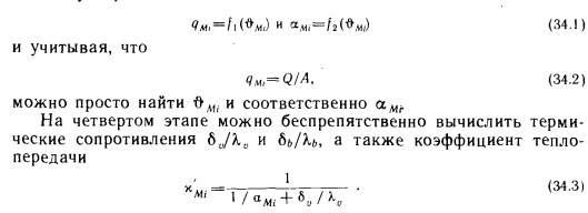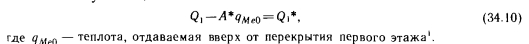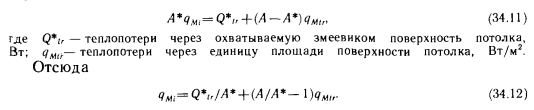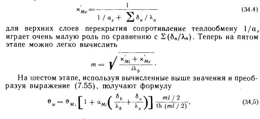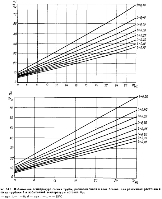 Расчет, основанный на использовании зависимостей линейной теплопроводностиВ большинстве случаев потолочное лучистое отопление рассчитывают, применяя зависимости линейной теплопроводности. Это связано с тем, что наиболее простым вариантом является размещение змеевиков в бетонном слое допустимой толщины (/0,07—0,08 м). Ниже излагается поэтапный ход расчетов. На первом этапе рассчитывают теплопотери помещения. Если брать за основу внутреннюю температуру tiy желательную при радиаторном отоплении, то результаты, получающиеся при стандартном способе вычислений, следует уменьшить на 10%. Для здания выше пяти этажей, имеющего общую лестничную клетку, теплопотери одинаковых помещений нужно уменьшать на 1% при увеличении высоты здания на каждый этаж. Опыт, приобретенный за последнее время, свидетельствует о том, что уменьшение может быть и больше 1%. Данное решение можно реализовать в связи с тем, что потолки для лучистого отопления на заводах не изготовляют и змеевики устанавливают в ходе строительных работ. Это позволяет выполнять змеевики различных размеров. На втором этапе рассчитывают змеевик для выбранного помещения первого этажа. Начинают с первого этажа, потому что не нужно учитывать теплоту, проникающую в эти помещения через пол. Наиболее экономичное решение возможно при условии, что система отопления будет располагаться под всем потолком. В этом случае единица длины трубы обеспечивает максимальную теплоотдачу (см. зависимость 7. 43). Однако практически все же нельзя считать, что отопительная система располагается под всем потолком, и поэтому теплоотдающая поверхность А =(0,9—0,95) А. На третьем этапе определяют количество теплоты, отдаваемой единицей поверхности вниз, и среднюю температуру греющей поверхности. Для этого можно использовать диаграмму на рис. 5.1, принимая обозначение Ьш (потолок) вместо ds. При этом, используя кривые ![]() Необходимо только определить параметр а входящий в у!Ме Это можно легко сделать с помощью рис. 5.3, поскольку избыточная температура пола может колебаться в пределах 2—4° С. Здесь вместо индекса, используемого на рис. 5.3, применяется индекс е, поскольку в данном случае стремятся отапливать прежде всего пространство под потолком. Достаточно точным средним значением является ае=8,2 — 8,4 Вт/(м2-К), которое впоследствии можно уточнить и при необходимости повторить вычисления. Это требуется очень редко, поскольку в коэффициенте теплопередачи ![]() ![]() Площадь поверхности А равна площади, охватываемой змеевиком, плюс сумма площадей дополнительных поверхностей шириной 1/2 по сторонам этой площади. Длину соединительных труб в потолке складывают с длиной змеевика. Вычисление параметров следующего этажа отличается тем, что потолочный отопительный прибор нужно рассчитывать уже только на величину ![]() Поскольку ЯмеаФЯмеъ так как Qo>Qi, значение, qMei нужно вычислять вновь. В дальнейшем изменение qМе уже настолько ничтожно, что значение qMei чаще всего можно сохранить равным предыдущему. Для верхнего этажа надо принимать во внимание следующее. Змеевик обычно охватывает не всю поверхность потолка, поэтому охватываемая часть должна отдавать и ту теплоту, которая передается части потолка, не имеющей змеевика. В этих условиях ![]() При построении расчетной диаграммы примем следующие значения средней избыточной темпера