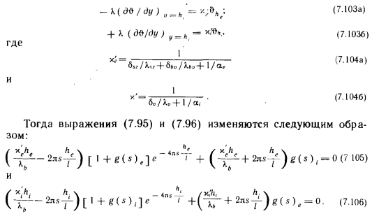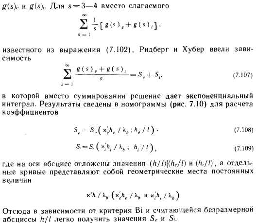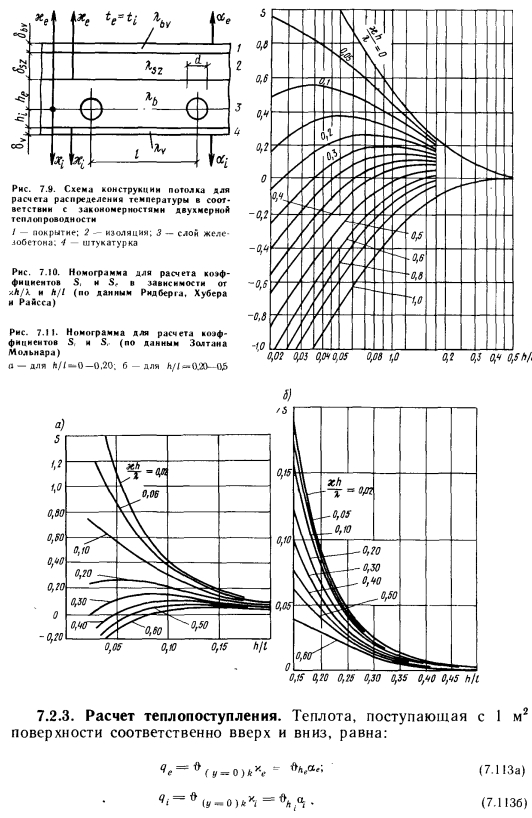 Распределение температуры в многослойной конструкцииРассмотрим встречающийся на практике случай, когда бетонный слой потолка или стены покрыт другими слоями (рис. 7.9). Мы не сделаем существенной ошибки, если примем, что двухмерная теплопроводность наблюдается только в бетонном слое. Дальнейшее же распространение теплоты с верхней и нижней его плоскости. через покрывающие и имеющие малый коэффициент теплопроводности слои осуществляется только в направлении у, при этом граничные условия принимают вид ![]() ![]() Отсюда в зависимости от критерия Bi и считающейся безразмерной абсциссы h/l легко получить значения Se и S. ![]() Лишь как незначительную неточность этого решения следует воспринимать то, что в данной задаче соотношение между he и hi влияет на результат, поскольку вообще решение с помощью диаграмм относится к зеркально-симметричной задаче. На рис. 7.11 показаны диаграммы Золтана Мольнара, которые он получил также исходя из того. Они дают те же значения Se и Si, что на рис. 7.10. При их использовании за основу нужно брать фактические значения. Исходя из сказанного выше и подставляя значения Sc и S, в зависимость (7.102), соответствующую избыточной температуре на средней линии, получаем ![]() ![]() |