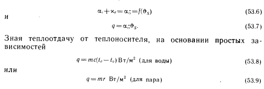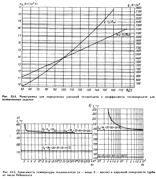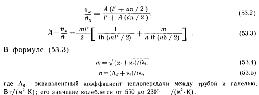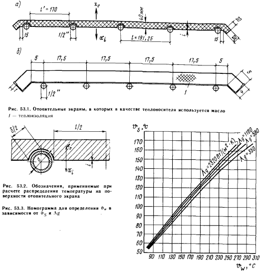 Распределение температуры на поверхности отопительного экранаРассмотрение теории расчета, связанного с распределением температуры на поверхностях отопительных экранов, излишне, поскольку она известна из различных литературных источников [49, 106, 109, 111]. Однако при использовании масла в качестве теплоносителя необходимо знать зависимости между средней избыточной температурой стенки трубы для теплоносителя [66] и средней избыточной температурой всего отопительного экрана [117] (рис. 53.2): ![]() На основании зависимостей (53.2) и (53.3) была построена номограмма (рис. 53.3), с помощью которой можно определить среднюю температуру всего отопительного экрана в зависимости от температуры стенки трубы при изменении Ag от 350 до 2320 Вт/(м2-К) ![]() Для облегчения расчета была построена номограмма, представленная на рис. 53.4. Здесь справедливы зависимости ![]() ![]() При проведении измерений проще всего все же использовать в качестве теплоносителя насыщенный пар, поскольку значение s почти не отличается от значения избыточной температуры теплоносителя д/, и вдоль трубы оно постоянно. Поэтому неточностей при измерениях можно почти полностью избежать. Измерения показали, что с помощью отопительного экрана с высокой температурой поверхности в крупном здании павильонного типа можно достигнуть 20—26% экономии по сравнению с энергией, требуемой для применяемых до сих пор видов воздушного отопления. |