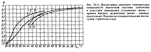 Результаты натурных исследований теплоощущенияИсследования показали, что с точки зрения умственной трудоспособности учащихся данное решение отопления можно считать приемлемым до некоторого предельного количества излучаемой теплоты, отнесенной к площади головы учащегося. Были выявлены два предела: предел приятного самочувствия, который может быть обеспечен при поступлении лучистой теплоты в количестве 35 Вт/м2; предел еще допустимого количества поступающей лучистой теплоты, составляющий 45 Вт/м2. В школе с группами продленного дня этот параметр имеет несколько иное значение, поскольку здесь дети находятся больше времени. ![]() На рис. 35.5 кривая А относится к теплопоступлению 35 Вт/м2, а кривая В — к теплопоступлению 45 Вт/м2. Кривая А в области, обследованной Кренко (60°С, ф = 0,14), допускает температуру поверхности отопительного прибора более высокую, чем кривая А, обеспечивающая, по Кренко, приятное самочувствие. Кривая В также допускает более высокую величину в области до 60°С, чем кривая В Кренко, и даже до 70°С и ср=0,17 дает значения температуры поверхности более высокие, чем согласно диаграмме, выведенной теоретически и служащей для продолжения кривой В Кренко (от точки М). Однако вверх от этой величины кривая проходит вместе с кривой Мачкаши. Таким образом, эксперименты показали, что количество доходящей до головы лучистой теплоты, равное 56 Вт/м2, недопустимо. Однако следует обратить внимание на то, что при соответствующем устройстве ленточного отопления в классных помещениях обычно получаются значения, меньшие 35 Вт/м2, и что коэффициент облученности следует всегда определять по отношению к ученику, сидящему в наиболее неблагоприятном месте — под центром того или иного ленточного отопительного прибора. Остальные ученики находятся на более благоприятных местах, и коэффициент облученности, а соответственно и доходящее до них количество излучаемой теплоты существенно меньше. Потолочное ленточное лучистое отопление выгоднее с точки зрения теплоощущения, чем лучистые приборы, покрывающие большую часть потолка или весь потолок, поскольку при таком решении отопления сравнительно незначительное перемещение учеников в большой мере изменяет количество доходящей до них лучистой теплоты. Поэтому и расчеты, выполненные для ученика, сидящего в наиболее неблагоприятном месте, из-за частых перемещений учащихся действительны лишь для очень небольшого периода занятий. Кроме того, количество лучистой теплоты, доходящей до ученика, сидящего в наиболее неблагоприятном месте, достигает предельного значения только при температуре наружного воздуха — 15°С и ниже. В Венгрии обычно бывает не более 2—3 таких дней за отопительный сезон. Результаты измерений свидетельствуют, что до пределов, указанных в диаграмме, лучистое отопление не оказывает вредного влияния на умственную деятельность учащихся. Естественно, пределы излучаемого количества теплоты действительны только в том случае, если обеспечиваются прочие комфортные условия (температура воздуха, относительная влажность). Следующим важным результатом серии исследований, имеющим отношение к теплоощущению, но в конечном итоге заслуживающим внимания и с экономической точки зрения, было подтверждение возможности применения неутепленного или частично утепленного пола. Применение 