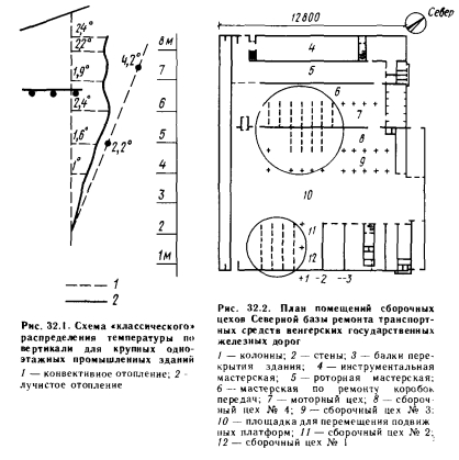 РЕЗУЛЬТАТЫ НАТУРНЫХ ИССЛЕДОВАНИЙ В ЗДАНИЯХ ПАВИЛЬОННОГО ТИПА С ЛУЧИСТЫМ ОТОПЛЕНИЕМВыше в главах 26 и 27 подробно рассматривались основные теоретические принципы, связанные с расчетом лучистого отопления крупных зданий павильонного типа. Теоретические соображения были проверены путем проведения экспериментов на моделях и натурных исследований. Это было необходимо для сравнения с данными, уже имеющимися в технической литературе (рис. 32.1). Исследования в натурных условиях проводились на следующих объектах; четыре помещения сборочных цехов Северной базы ремонта транспортных средств венгерских государственных железных дорог (лучистое отопление с помощью экранов); помещение канатного цеха кабельного комбината (смешанное отопление); ![]() два помещения цехов учебной мастерской Министерства труда в Будапеште (лучистое отопление с помощью экранов); два помещения цехов вспомогательного производства объединения «Икарус» (воздушное отопление); помещение моторного цеха металлургического комбината им. В. И. Ленина в г. Диошдьер (отопление инфракрасными излучателями, действующими на природном газе). |