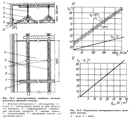 Системы кассетного потолочного лучистого отопленияСистемы лучистого отопления, располагаемые в фальшпотолке, применяют прежде всего в тех помещениях общественных зданий, где бывает большое число людей (лекционные залы, тамбуры и т. д.). Такие системы широко применяют как в Венгрии, так и за рубежом. Опишем два решения, разработанных в Венгрии. Первое решение представляет собой систему лучистого потолочного отопления с алюминиевыми кассетами (рис. 34.4). Количество теплоты, отдаваемой подобным отопительным прибором вниз, показано на рис. 34,5, а, а количество теплоты, отдаваемой вверх,— на рис. 34,5, б. Второе решение—система лучистого потолочного отопления с гипсовыми кассетами, где отопительные трубы располагаются в пространстве над подвесным потолком из перфорированных гипсовых листов размером 450X450 мм (рис. 34.6). ![]() Из конструктивного решения ясно видно, что такое устройство может обеспечивать гораздо меньшую удельную теплоотдачу (рис. 34.7). |