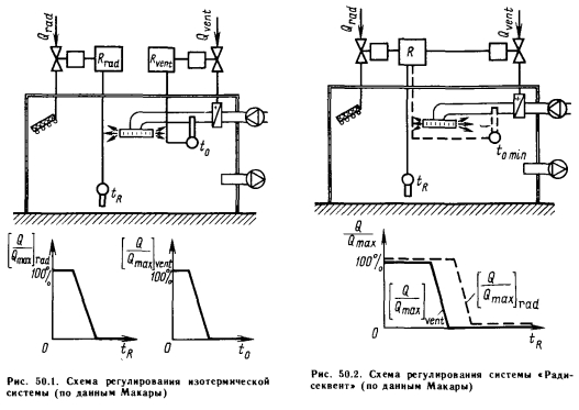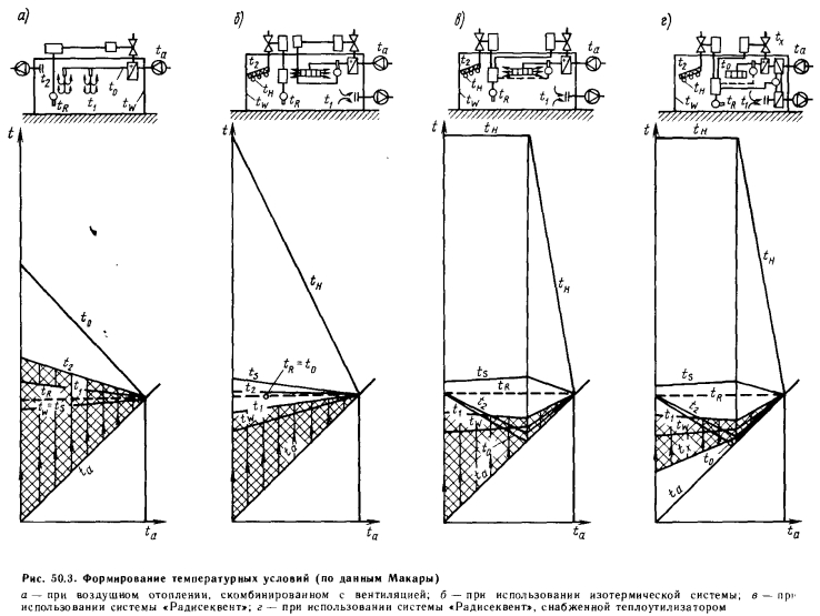 СИСТЕМА «РАДИСЕКВЕНТ»Дьёрдь Макара, занимаясь вопросами вентиляции зданий павильонного типа с лучистым отоплением, разработал систему «Радисеквент» [120]. Она представляет собой остроумное решение вентиляции холодным воздухом, скомбинированной с лучистым отоплением, обеспечивающее экономию энергии. Суть этого решения в следующем. При подборе температуры приточного воздуха ta наиболее приемлемым представляется такое решение, когда воздух подают подогретым до результирующей температуры tR в рабочей зоне, поскольку при этом возникает элементарная, легко регулируемая квазиизотермическая вентиляция. Место ввода и подачи свежего воздуха можно выбрать с учетом традиционных решений, применяемых в вентиляционной технике. Способ регулирования системы весьма простой (рис. 50.1): теплоподача лучистого отопления Qrad изменяется регулятором Rrad по температуре в здании t & а теплопроизводительность Qvent на подогрев воздуха — регулятором Rvent по температуре приточного воздуха t0. Такое решение ниже будет называться лучистым отоплением с изотермической вентиляцией, а проще — изотермической системой. Когда лучистое отопление полностью выключено регулятором, так как, например, внутренние теплопоступления компенсируют теплопотребность не только для отопления, но и для подогрева свежего воздуха, целесообразно, чтобы регулятор температуры Rrad уменьшал и теплопроизводительность Qvent (это действие на рис. 50.1 не показано). ![]() Другая, менее приемлемая, но заслуживающая внимания возможность существует, когда при уменьшении теплопотребности для отопления вначале лучистое отопление работает с неизменной производительностью Qrad = const и при этом уменьшается производительность Qvent (рис. 50.2). Это означает, что воздух подается при температуре, которая ниже температуры в помещении и подогревается до внутренней температуры tt за счет избытка теплопроизводительности лучистого отопления и, возможно, за счет внутренних теплопоступлений. Уменьшение теплоподачи лучистого отопления Qrad осуществляется только при условии, что температура приточного воздуха t0 достигла минимальной температуры t0,mm, вызывающей ощущение сквозняка, или температуры наружного воздуха ta. Рассмотрим такие виды системы «Радисеквент», где вентиляционный воздух подается в пространство под потолком и удаляется снизу, из рабочей зоны, а лучистый поток направляется сверху, в рабочую зону. Ниже сопоставляются условия, формирующиеся в помещении, при использовании такой системы лучистого отопления, скомбинированной с воздушным отоплением и с изотермической вентиляцией. При этом в формировании температуры поверхностей ограждающих конструкций и лучистых отопительных приборов, а также температурных полей воздуха и внутренних воздушных потоков имеется существенная разница, и поэтому для обеспечения одних и тех же комфортных требований требуется различный расход энергии. Формирование температурных условий показано на рис. 50.3. ![]() Для простоты будем считать здания павильонного типа лишенными технологических источников теплоты, а также примем, что формирование внутренних условий в стационарных режимах является линейной функцией разности внутренней результирующей температуры tR и средней наружной температуры ta. Пренебрежем в первом приближении изменениями подвижности воздуха в р