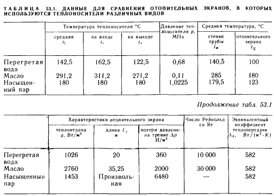 Сравнение теплоносителей при использовании отопительных экрановВ табл. 53.1 приведены сопоставительные характеристики отопительных экранов, в которых используются различные виды теплоносителя. Температура перегретой воды и давление равны соответственно te= 162,5°С и р = 0,68 МПа, так как для получения воды в теплообменнике был принят в расчет насыщенный пар с температурой г=180°С и давлением pg= 1,0225 МПа. ![]() Предполагалось, что при непосредственном паровом отоплении применяется пар с такими же характеристиками. Следует заметить, что эти характеристики представляют собой оптимальные значения с точки зрения экономичности технического решения. Согласно данным табл. 53.1, при использовании масла в качестве теплоносителя теплоотдача в 2,7 раза больше, чем при применении перегретой воды, и в 1,9 раза больше, чем при использовании насыщенного пара, имеющего давление 1,0 МПа. Средняя температура теплоносителей в той же последовательности составляет 291,2; 142,5 и 180°С, а необходимое давление соответственно: 0,11; 0,68 и 1,0225 МПа. Средняя температура отопительного экрана: 180; 100; 123°С. Применение масла в качестве теплоносителя имеет значительные преимущества. Потери давления в отопительном экране для масла, пара и воды соответственно равны: 27 491, 5154, 288 Па. Следует заметить, что сделанные выше выводы действительны для отопительных экранов как с механическими, так и со сварными соединениями. |