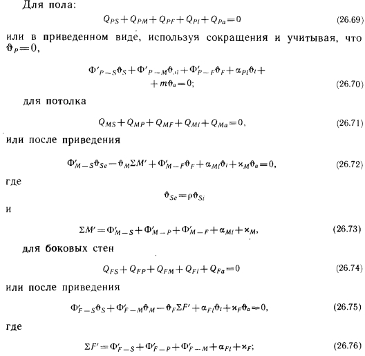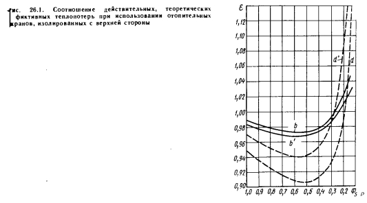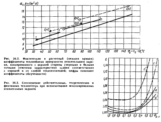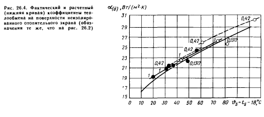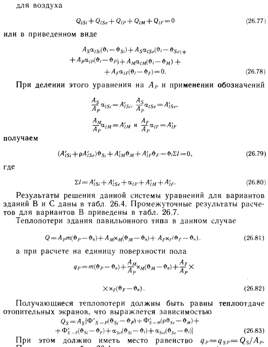Температурные условия помещений при постоянной температуре во всех точках его объемаЭто условие, очевидно, наиболее благоприятно как в отношении температуры, формирующейся на окружающих поверхностях и в воздушном пространстве, так и в отношении теплопотерь и теплоотдачи отопительных экранов. На практике можно обеспечить лишь приближение к таким условиям, но достичь их невозможно. В данном случае уравнения теплового баланса можно записать в следующем виде. ![]() ![]() Поскольку в табл. 26.4 известны радиационная ts и результирующая tR температура, можно вычислить и коэффициент теплообмена на поверхности отопительного экрана по формуле (26.55), который, как и ранее, сравнивается со значениями, полученными по зависимостям (25.6) и (25.15) — (25.17). Ниже дан анализ расчетов по двум вариантам зданий. Температурные параметры и условия теплопоступления при использовании отопительных экранов с теплоизоляцией на верхней стороне. При рассмотрении данного случая были сделаны следующие выводы. ![]() 1. Теплопотери лишь в очень малой степени зависят от соотношения принятой площади и температуры поверхности отопительного экрана. Несколько большие теплопотери наблюдаются при установке экрана с малой площадью и высокой температурой поверхности. 2. При использовании отопительных экранов, снабженных теплоизоляцией, при коэффициенте облученности плоскости экрана на пол Ф5_Р0,25 — 0,30 действительные теплопотери меньше теоретических (рис. 26.1). При поверхностном анализе представляется неожиданным, что при равномерном распределении температуры воздуха в помещении с потолком и стенами, оснащенными слабой теплоизоляцией, теплопотери меньше, чем при использовании ограждающих конструкций с хорошей теплоизоляцией. Это объясняется тем, что отопительные экраны, изолированные сверху, излучают в сторону потолка лишь очень небольшое количество теплоты, и теплопотери через потолок ничтожно малы. Большая часть излучения доходит до пола, коэффициент теплопередачи которого на порядок меньше, чем у остальных поверхностей. Однако энергия теплового излучения значительна именно из-за компенсации теплопотерь через стены и потолок, и это определяет радиационную температуру и в конечном итоге результирующую температуру, от которой зависит самочувствие человека. ![]() Необходимо объяснить также, почему теплопотери получаются наименьшими при коэффициенте облученности Ф5_Р = 0,65 — 0,45. Ведь при этом устанавливается такое соотношение между тепловой энергией, излучаемой по направлению к полу, радиационной температурой и результирующей температурой, которое решающим образом определяет самочувствие человека, находящегося в помещении. При бесконечно большой площади в плане коэффициент облученности плоскости отопительных экранов на пол равен единице и влияние стен на человека исключается, но из-за малых теплопотерь температура поверхности отопительных экранов настолько малы, что, с точки зрения обеспечения желаемой радиационной температуры, это приводит к более неблагоприятным последствиям, чем преимущества, получаемые благодаря исключению охлаждающего влияния поверхностей стен. При Ф5-Р0,35, т. е. при незначительном излучении, направленном к полу, больше теплоотдача в направлении боковых стен и их коэффициент облученности на человека, что оказывает на радиационную 