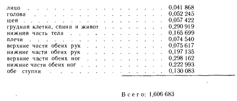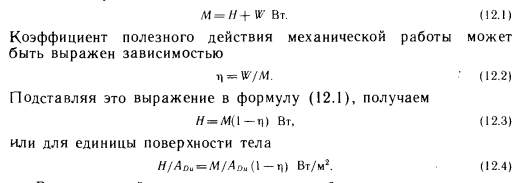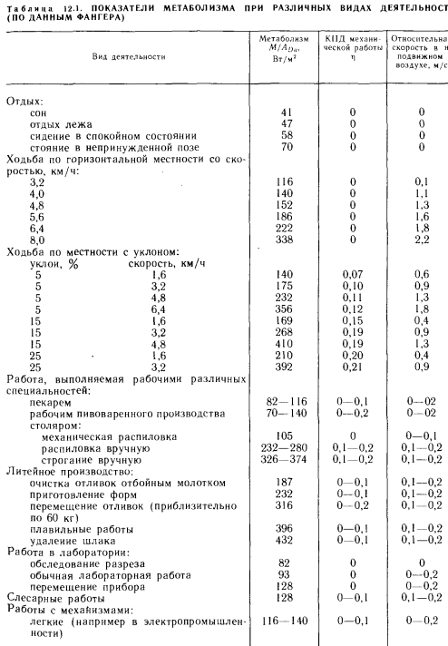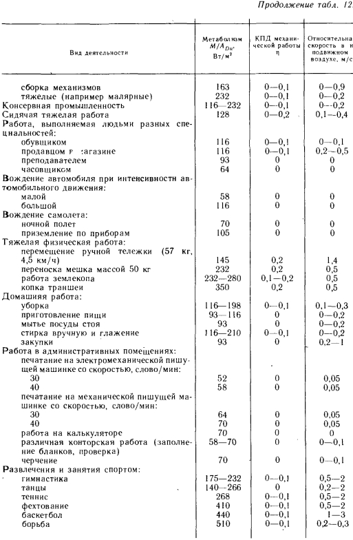 ТЕПЛОПРОДУКЦИЯ ТЕЛА ЧЕЛОВЕКАВ теле человека происходит процесс горения, и высвобождающаяся в ходе него энергия отчасти выделяется в виде теплоты, другая же ее часть идет на выполнение полезной физической работы. Физиологи определяют энергопродукцию тела человека расходом кислорода. Взрослый человек в состоянии покоя расходует при так называемых нормальных условиях обмена веществ кислород в количестве 0,42 10~5 м3/с. Если теплоту, высвобождающуюся при сгорании кислорода, принять равной 21-103 Дж/м3, то расход энергии будет составлять 88 Вт [1]. При выполнении мускульной работы потребление кислорода возрастает во много раз по сравнению с состоянием покоя. В среднем человек в течение короткого периода может расходовать в 12 раз больше кислорода, чем в состоянии покоя, т. е. 0,5-10*4 м3/с, что соответствует 1060 Вт. В ходе обмена веществ коэффициент полезного действия так называемой полезной работы, согласно данным Лалинта [1], а также Уинслоу и Харрингтона [178], составляет 20%, значит, КПД организма человека больше КПД среднего паровоза, равного 14%. Обмен веществ происходит при постоянной температуре 37±0,5°С. В этом заключается основное различие между простым горением (температура которого непостоянна) и обменом веществ. В отношении средней работоспособности имеются лишь приблизительные данные. Согласно последним, расход кислорода у среднего молодого человека при систематической работе равен 0,17 • 10~4 м3/с, что соответствует 350 Вт. Если вычесть отсюда значение, соответствующее основному обмену веществ, т. е. 88 Вт, то получится 262 Вт. Потребность в энергии для выполнения полезной работы на практике определяют по расходу кислорода, при этом из замеренного значения расхода вычитают расход кислорода в состоянии покоя (т. е. расход, приходящийся на основной обмен веществ). В специальной литературе можно найти таблицы этих величин. В зависимости от интенсивности работу делят на три категории: а) легкой называют такую работу, в ходе которой полный расход кислорода не превышает вдвое расхода, характерного для состояния покоя, т. е. меньше 0,85- 10~5 м3/с, или 175 Вт (например, сидячая работа); б) при выполнении работы средней тяжести расход кислорода в 2—4 раза больше значения, соответствующего состоянию покоя, т. е. он составляет 0,85—1,7-Ю-5 м3/с (175—350 Вт), откуда потребность в энергии для выполнения мышечной работы равна 88—264 Вт (немеханизированная домашняя и ручная кустарная работа); в) при выполнении тяжелой работы полный расход кислорода в 4—8 раз превышает расход в состоянии покоя, т. е. он составляет 1.7—3,4-10“5 м3/с. Если из полного расхода энергии 350—700 Вт вычесть значение, характерное для основного обмена веществ, получится 264—615 Вт. К этой категории можно отнести большинство видов работ, выполняемых в тяжелой промышленности и сельском хозяйстве. Для четкого понимания способов тепловыделения и теплообмена тела человека необходимо знать некоторые основные понятия, которым ранее не уделяли достаточного внимания. Метаболизм, или метаболическая теплота. Ее численное значение физиологи определяют расходом кислорода, однако на практике обычно пользуются таблицами тепловых эквивалентов, составленными на основе измерений этого расхода. Поверхность Дюбуа. Это поверхность тела, учитываемая при определении тепловыделения или тепловосприятия человека и выражаемая за