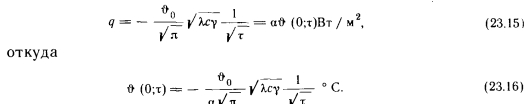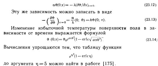 Теплота, проникающая в пол при постоянном режиме работы системы отопленияМожно предположить, что при включении отопления между полом и окружающей его средой возникает разность температуры. В действительности положение несколько иное, так как потребность в отоплении возникает тогда, когда наружная температура выше расчетной, а внутренняя температура и температура пола и соответственно верхнего слоя грунта, расположенного под ним, еще почти или совсем не отличаются друг от друга. Решение дифференциального уравнения изменяющейся во времени линейной теплопроводности для какого-либо слоя на глубине х в момент т дает избыточную температуру $(х, т), вычисляемую в зависимости от d(0;0)=fro — избыточной температуры поверхности пола относительно температуры грунта в момент т = 0. При лучистом отоплении важно прежде всего определить избыточную температуру поверхности пола и теплоту, забираемую этой поверхностью от отапливаемой окружающей среды. Для этого можно воспользоваться так называемым граничным условием третьего рода, согласно которому теплота, представляющая собой алгебраическую сумму теплопоступлений из окружающей среды на поверхность пола за счет конвекции и излучения, проходит через эту поверхность за счет теплопроводности, т. е. для какого-либо момента действительно условие ![]() Формирование температуры поверхности пола можно также проанализировать, исходя из следующих соображений. Предположим, что по истечении некоторого времени количество теплоты, проходящей за счет теплопроводности через поверхность пола, было бы таким, как если бы начальную избыточную температуру определяли не в окружающей среде, а на поверхности пола. Используя граничное условие третьего рода и зависимость (23.4), можно записать ![]() Значения, вычисляемые на основании этого предположения и зависимости (23.16), по сравнению с точным значением при т> 100 ч отличаются от него на сотые доли градуса, а при т=1000 ч (т. е. приблизительно через полтора месяца) равны ему. Путем небольших преобразований выражение (23.14) можно привести к виду ![]() Анализ зависимостей (23.16) и (23.17) показывает, что избыточная температура пола тем больше приближается к температуре окружающей среды, чем меньше показатель тепловой активности пола. Даже при сравнительно больших значениях b через месяц после начала постоянного отопления теплопотери через пол по сравнению с теплопотерями через остальные ограждающие конструкции ничтожно малы. |