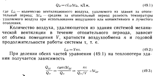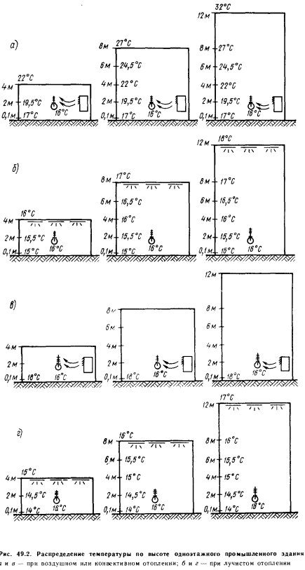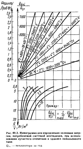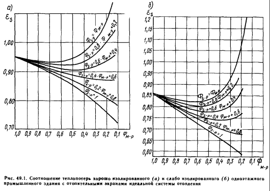 ТЕПЛОЗАТРАТЫ НА ОТОПЛЕНИЕ И ВЕНТИЛЯЦИЮ ЗДАНИЙ ПАВИЛЬОННОГО ТИПАВ крупных одноэтажных промышленных зданиях имеются большие возможности экономии тепловой энергии в зависимости от того, в какой мере удается повысить коэффициент облученности отопительных экранов на пол (рис. 49.1), причем рис. 49.1, а относится к зданию с хорошей теплоизоляцией, а рис. 49.1, б — к зданию со слабой теплоизоляцией. Если принять во внимание, что основное количество теплоты, расходуемой при радиаторном отоплении, приблизительно на 8—10% больше, чем теплопотери без добавок, служащие основой сопоставления, то теплопотери, вычисляемые по действующему стандарту, для одноэтажного промышленного здания с хорошей теплоизоляцией можно снизить на 15%, а для здания со слабой теплоизоляцией — на 20%. В ходе практических расчетов теплопотери, вычисленные по стандарту, уменьшаются путем умножения на коэффициент е, определяемый по рис. 49.1. Одноэтажное промышленное здание в целом можно считать строением со слабой теплоизоляцией и поэтому коэффициент уменьшения е, являющийся функцией величины Фм_р, обычно равен 0,8, иными словами, вычисленные теплопотери сокращаются на 20%. Это объясняется тем, что при отоплении экранами наибольшая часть выделяемой теплоты поступает непосредственно в рабочую зону. Вопросы, связанные с расходом энергии в одноэтажных промышленных зданиях при различных способах отопления и вентиляции, изучал д-р Дьёрдь Макара. Рассмотрим полученные им результаты. При использовании лучистого отопления потребляемая тепловая энергия уменьшается по сравнению с применением воздушного отопления вследствие более низкой температуры воздуха, которую следует обеспечивать в рабочей зоне, а потому и во всем здании, и меньшей степени расслоения температуры по вертикали. Экономия тепловой энергии здесь достигается благодаря тому, что между внутренней частью здания и наружным пространством при лучистом отоплении возникает меньший перепад температуры. Согласно литературным данным, применение лучистого отопления при соответствующей эксплуатации приводит к экономии энергии, поэтому системы лучистого отопления можно проектировать на меньшую теплопроизводительность, чем воздушное или конвективное отопление. Соответственно целью исследований было определить экономию теплоты, которую можно принимать во внимание при расчете лучистого отопления, чтобы эту экономию учитывать в расчетах капитальных затрат на отопительные установки и теплоснабжение. ![]() В материалах теоретических и экономических исследований, проводившихся в одноэтажных промышленных зданиях, обычно сообщается о полученной экономии потребляемой тепловой мощности, равной около 20% (15—30%). Это относится к производительности системы отопления, соответствующей расчетной наружной температуре. Однако интерес представляет не это значение, определенное для экстремальных погодных условий, а экономия энергии при средних погодных условиях, фактически существующих в отопительный период. В специальной литературе раньше было очень мало данных по этому вопросу, а те сведения, которые приводились, обычно относились к расчетным условиям. В последнее время появились некоторые новые данные. Например, имеется сообщение, что запатентованная в Великобритании система лучистого отопления, в которой исполь