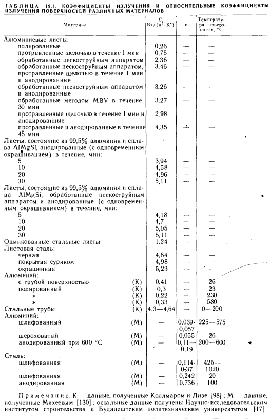 ВЫБОР, РАСЧЕТ И ОПРЕДЕЛЕНИЕ МЕСТА РАЗМЕЩЕНИЯ ЛУЧИСТЫХ ОТОПИТЕЛЬНЫХ ПРИБОРОВДля обеспечения необходимой внутренней температуры и соответствующего теплоощущения необходимо правильно выбрать отопительный прибор. При выборе лучистых отопительных приборов следует учитывать те же факторы, что и при применении других систем отопления, например, экономичность, параметры применяемого теплоносителя, ассортимент приборов и т. д. Однако здесь имеются и некоторые особенности. 1. Прежде всего следует учитывать температуру теплоносителя, а значит и температуру поверхности отопительного прибора, допускаемую с точки зрения теплоощущения. Этот вопрос относится к контролю теплоощущения и будет рассмотрен на следующей стадии расчета, однако желательно еще до1 определения типа и размеров прибора произвести выборочный контроль теплоощущения, особенно при использовании пара высокого давления, перегретой воды или масла в качестве теплоносителя. 2. Необходимо принимать во внимание облицовку поверхности лучистого отопительного прибора, точнее — значение коэффициента излучения С. Как показала практика, недооценка значения этого коэффициента приводит к отрицательным последствиям. Известен случай, когда было возведено крупное одноэтажное промышленное здание, в котором лучистые отопительные приборы выполнили из алюминия, и, чтобы было «красиво», всю поверхность отполировали до блеска.. К большому недоумению создателей, установка не обеспечивала желаемую теплопроизводительность. Причина заключалась в том, что коэффициент излучения полированной алюминиевой поверхности при температуре около 100°С составляет приблизительно 0,2, анодированной поверхности — около 4,0, а окрашенной поверхности — 4,5 Вт/(м2-К4). Окрашивание поверхности дало положительный результат, что подтвердило справедливость сказанного выше. При расчете отопительного прибора, расположенного в замкнутом пространстве, коэффициент излучения его поверхности может быть определен с учетом зависимости (2.39), так как поверхность прибора по сравнению с поверхностью окружающих поверхностей чрезвычайно мала. Таким образом, при вычислениях лучистой теплоотдачи отопительного прибора в расчет можно принимать коэффициент излучения его поверхности. Значения коэффициента излучения материалов, применяемых для изготовления отопительных приборов, можно найти в специальной литературе, в частности, в каталогах. В некоторых случаях, прежде всего в советской технической литературе, вместо коэффициента излучения С встречается относительный коэффициент излучения е, равный ![]() Однако в литературе имелось недостаточно данных, которые можно было использовать для расчета лучистых систем отопления, поэтому в 1968 г. венгерский Научно-исследовательский институт строительства совместно с кафедрой физики Будапештского технического университета провели исследования для получения данных, необходимых для проведения расчетов. Полученные ими результаты приведены в табл. 19.1. Из табл. 19.1 видно, что при использовании изделий из стали значения коэффициента излучения в основном близки к значениям, известным ранее. При применении же алюминия оптимальным оказывается использование листов, обработанных методом анодирования с окрашиванием. С помощью таких поверхностей можно достигнуть значения 