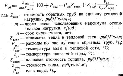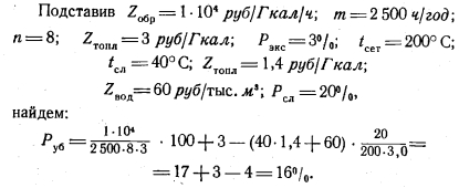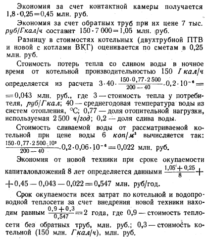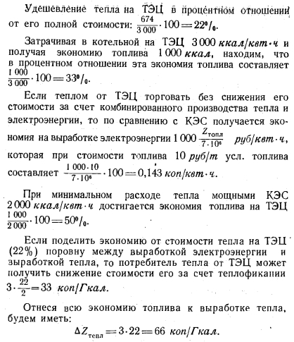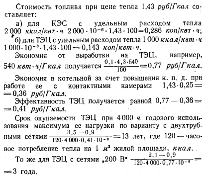 ЭКОНОМИЧЕСКИЕ ПОКАЗАТЕЛИ ТЭЦ С ОДНОТРУБНЫМИ ВОДОПРОВОДНЫМИ ТЕПЛОВЫМИ СЕТЯМИА. Эффективность теплофикации распределительных тепловых сетей 200 Вт ![]() Сооружение небольших ТЭЦ на значительных расстояниях от городов может быть оправдано расположением водоемов и освобождением атмосферы городов от загрязнения. Водопроводная теплофикация может сократить количество холодной воды до 40—50%. Если дальний водопровод холодной воды должен иметь две нитки, то одна из них может быть заменена 200-градусным теплопроводом. Такой же должна быть и вся водопроводная сеть городов. При дорогой водопроводной воде, например в городах Дальнего Севера, эти два водопровода целесообразно объединять в единую общую систему горячего и холодного водоснабжения [Л. 19], соединяя теплопроводы 200 В с водопроводами холодной воды че,рез обратную трубу системы отопления. В этом случае потерь воды со сливом не получается. Охлажденная до любого предела вода после системы отопления поступает в водопровод холодной воды. Определяя эффективность распределительных водопроводов 200 В» для Москвы, оцениваем стоимость прокладки тепловых сетей, рассчитанных на температуру 150° С при двухтрубной системе теплоснабжения от РК в 14 000 руб- ч)Г кал. Переход на тепловые сети 200 В» позволяет сократить эти расходы на 60%, что дает 14000-0,60 = = 8 400 руб-ч/Гкал. Столь существенное снижение стоимости тепловой сети заставляет считать переход на распределительные тепловые сети 200 В» актуальным мероприятием, при котором возможно получить снижение стоимости тепла у потребителя, даже большее, чем от его выработки на ТЭЦ с двухтрубной схемой теплоснабжения. Б. Годовые убытки от прокладки обратных труб в тепловых сетях и экономические показатели ТЭЦ с однотрубными водопроводными тепловыми сетями Годовые убытки от обратных труб в тепловых сетях ТЭЦ ![]() ![]() Ценность тепла в обратных трубах незначительна, что не оправдывает капиталовложений в эти трубы. К числу недостатков двухтрубной системы тепловых сетей следует отнести следующие: а) От потребителя на ТЭЦ возвращается теплая вода, которую можно использовать на месте для горячего водоснабжения. б) Значительно увеличиваются расход металла на трубы и капиталовложения в тепловые сети. в) Снижаются темпы строительства тепловых сетей г) Создаются благоприятные условия для наружной коррозии труб из-за низкой температуры в обратной магистрали. д) Задерживается строительство мощных ТЭЦ. е) Ухудшается гидравлический режим работы тепловых сетей. ж) Удорожается отпускаемое тепло. з) Уменьшается выработка электроэнергии на ТЭЦ. и) Перекачка воды по обратным трубам требует дополнительных затрат электроэнергии. к) Применение закрытых двухтрубных систем не стимулирует развития местных систем горячего водоснабжения. В. Экономические показатели теплофикации и районных однотрубных водопроводных систем теплоснабжения на газовом топливе Для котельной мощностью 150 Гкал/ч при 4 ООО ч использования общей тепловой нагрузки имеем годовой отпуск тепла 150 - 4 000 = 0,6-10 Гкал/год. Стоимость этого тепла при цене 3 руб/Гкал составит 3-0,6= 1,8 млн. руб. ![]() Стоимость систем теплоснабжения от ТЭЦ и районных котельных с котлами ВТИ и новыми котлами представляется в следующем виде: 1) для ТЭЦ и двухтрубной тепловой сети—3,5 руб/м2 жилой площади; 2) для ТЭЦ и однотрубной тепловой с
