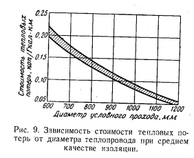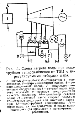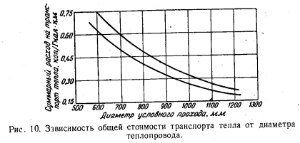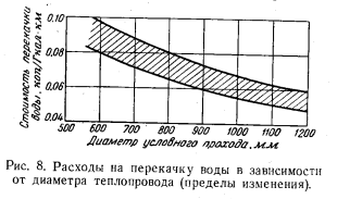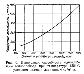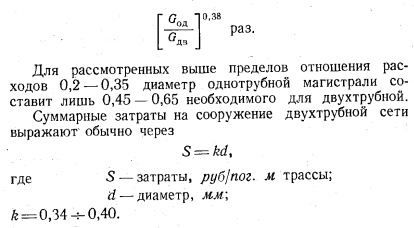 ХАРАКТЕРИСТИКИ ОДНОТРУБНЫХ СИСТЕМ ТЕПЛОСНАБЖЕНИЯА. Характеристики транспорта тепла Количество воды, транспортируемое по однотрубной магистрали, составляет лишь часть общего количества воды, циркулирующего в двухтрубной тепловой сети. Отношение количеств воды, циркулирующих в двухтрубной (Одв) и однотрубной (G0д) магистралях, определяется долей теплового потребления, охватываемого ТЭЦ однотрубного теплоснабжения, с одной стороны, и расчетными температурами — с другой. Это отношение может быть выражено как ![]() В большинстве двухтрубных систем применяются параметры воды 150 — 70° С. С учетом охлаждения воды из обратной магистрали в первой ступени теплообменника горячего водоснабжения до 58° С возможен переход на график 150 — 58° С. Для а = 0,42 соотношение расходов воды в двухтрубной и однотрубной магистралях составит в зависимости от графика двухтрубной сети: т. е. в однотрубной магистрали расход воды примерно в 5 раз меньше, чем в двухтрубной. Даже при переходе на повышенный график температур двухтрубной сети 180—58° С (с учетом охлаждения воды из обратной магистрали) и увеличении доли тепла, передаваемого по однотрубной магистрали, до 50% по ней будет протекать лишь 35% того расхода воды, на который необходимо рассчитывать двухтрубные магистрали. ![]() Этот показатель является решающим, так как затраты на сооружение магистрали зависят от расчетного расхода воды. При сохранении в обоих случаях одинакового удельного падения давления на 1 пог. м трассы диаметр, требующийся для однотрубной магистрали, по сравнению с эквивалентной двухтрубной понизится в ![]() Для оценки затрат на однотрубные магистрали следует принять й=0,18—0,22. Трасса однотрубной магистрали для той же тепловой нагрузки обслуживаемого района или города потребует вложений лишь в размере 0,24—0,35 затрат, необходимых для той же трассы в двухтрубном исполнении Дополнительно следует заметить, что при транспорте больших количеств воды разница затрат еще увеличится, так как необходимо во избежание применения недопустимо больших диаметров труб в двухтрубном вариант те переходить на параллельную прокладку двух магистралей в тех случаях, когда однотрубная трасса может быть осуществлена в однониточном варианте. Так, для транспорта тепла в количестве 1 200 Гкал/ч потребовались бы две параллельные двухтрубные магистрали диаметром 2X1000 мм, для однотрубного же варианта необходима прокладка лишь одной трубы диаметром не более 800 мм при одинаковой в обоих случаях температуре теплоносителя (расчетной) 180° С. Еще большая разница имеет место при необходимости выполнения двухтрубной трассы на температуру не выше 150°С. Сокращение затрат на сооружение магистралей в 3—4 раза (а при больших количествах транспортируемого тепла — до 5 раз) является важнейшим стимулом для создания однотрубных систем. Не менее важным является и экономия металла на магистрали. При одинаковом расчетном давлении толщина стенки трубы пропорциональна ее диаметру, а вес трубы пропорционален квадрату диаметра. Поэтому уменьшение диаметра в 3 раза при одинаковом расчетном давлении приведет к снижению затраты металла в 9 раз. Следует отметить, что в двухтрубном варианте в ряде случаев окажется более рациональным снижение расчетной температуры воды до 150°С, с тем чтобы избежать высокого статического давления и свя