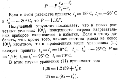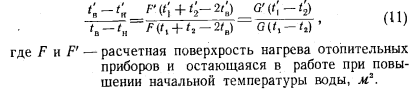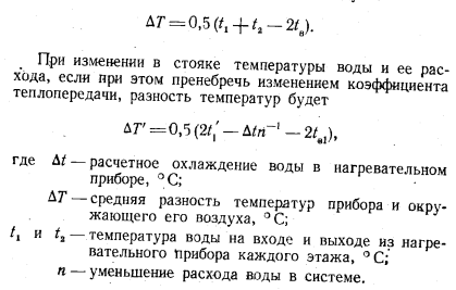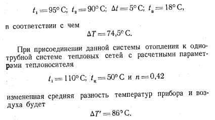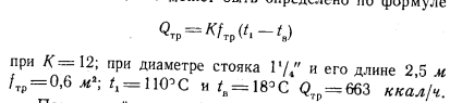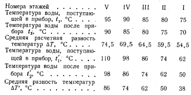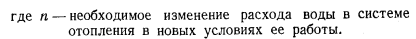 ИСПОЛЬЗОВАНИЕ СУЩЕСТВУЮЩИХ СИСТЕМ ОТОПЛЕНИЯ ПРИ ПЕРЕХОДЕ К ОДНОТРУБНЫМ ТЕПЛОВЫМ СЕТЯМВ настоящее время, как известно, наибольшее распространение в качестве систем отопления жилых зданий имеют двухтрубные и однотрубные системы водяного отопления, рассчитанные на температурный перепад 25° С (95—70). Использование таких систем при применении однотрубных тепловых сетей в том виде, в каком они существуют в настоящее время, почти не представляется возможным. Действительно, однотрубные системы отопления при присоединении их к однотрубным тепловым сетям смогли бы удовлетворительно работать только в том случае, если бы при эксплуатации их были сохранены те параметры теплоносителя, на которые они были рассчитаны. Сохранить для однотрубных систем отопления начальную температуру воды применением соответствующего коэффициента смешения возможно, но сохранить на прежнем уровне температуру воды по выходе ее из систем отопления не представляется возможным, так как это привело бы к сокращению расхода сетевой воды в системе горячего водоснабжения и, следовательно, к образованию остатка сетевой воды. Для того чтобы остатка не было, необходимо было бы чрезмерное завышение начальной температуры воды в тепловых сетях, которое оказалось бы практически либо невозможным, либо нерентабельным; кроме того, не следует забывать, что повышение обратной температуры воды в системах отопления снижает расход сетевой воды в системах горячего водоснабжения. Снижение конечной температуры воды в существующих системах отопления, даже в двухтрубных, при соответствующем повышении их начальной температуры не возможно, так как это привело бы к резкой вертикальной разрегулировке их. Поэтому представляется, что присоединение к однотрубным тепловым сетям существующих систем отопления как двухтрубных, так и однотрубных возможно будет осуществлять только при посредстве установки в них. на каждом нагревательном приборе автоматически действующих регулировочных кранов, разработка которых ведется в настоящее время рядом различных организаций. Чтобы судить о том, как будет работать однотрубная система отопления при условии оборудования всех нагревательных приборов автоматическими регулировочными кранами, целесообразно рассмотреть режим работы в таких условиях одного стояка однотрубной системы. Прежде всего необходимо проверить, поскольку температура воды в стояке может быть значительно повышена, не будут ли верхние комнаты перегреваться и при выключенных нагревательных приборах, когда тепло в помещение может поступать только от труб (стояки и подводки). В этих условиях поступление тепла в помещение может быть определено по формуле ![]() Полученный результат показывает, что даже в том случае, когда диаметр стояка будет иметь размер 42 мм (1Л) и температура поступающей в него воды будет поднята до 110° С, теплоотдача всех труб в помещении не сможет обеспечить потребности в тепле обогреваемых ими помещений, особенно при расположении этих помещений в верхних этажах, которые всегда имеют дополнительные потери тепла через потолочное перекрытие. При работе нагревательного прибора самого верхнего этажа и всех последующих за ним будет происходить следующее. Теплоотдача каждого из нагревательных приборов однотрубного стояка будет определяться разнос