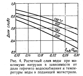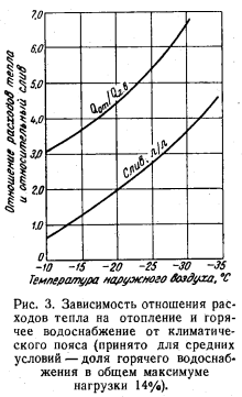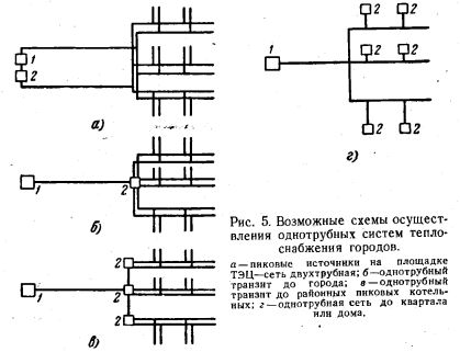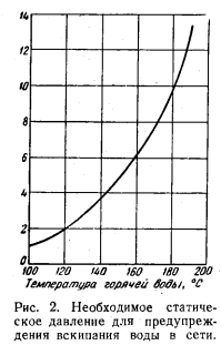 ОСОБЕННОСТИ ОДНОТРУБНЫХ СИСТЕМ ТЕПЛОСНАБЖЕНИЯОднотрубная система целесообразна только при наличии потребителей, непосредственно разбирающих сетевую воду. Она может являться частью общей системы теплоснабжения города или района, остальная часть которой остается двухтрубной. При этом доля тепловой нагрузки, воспринимаемая однотрубной частью системы, может быть различной в зависимости от соотношений тепловых нагрузок с возвратом воды (отопительно-вентиляционное потребление) и с ее потреблением (бытовое и промышленное использование горячей воды). Верхний предел температуры воды ограничен ее свойствами и необходимым статическим давлением, при котором может быть устранена опасность вскипания воды в теплопроводе. Эта зависимость показана на рис. 2. Из графика видно, что переход от применяемых в городских тепловых сетях температур до 150°С к 180°С увеличивает необходимое статическое давление в 2 раза (с 5 до Шага), а три переходе к 200° С в 3 раза (16 атм). При таком высоком статическом давлении почти не остается располагаемого перепада на перекачку воды, так как при применяемых трубах давление не должно превышать 20 кГ/см2. Практическое осуществление таких тепловых сетей потребует многократной перекачки горячей воды при сравнительно длинном транзите ![]() В реальных условиях положение ухудшается при учете следующих факторов: 1. Отдельные здания и кварталы города имеют различное соотношение нагрузок на отопление, вентиляцию и горячее водоснабжение, причем в некоторых кварталах роль горячего-водоснабжения ничтожно мала. ![]() 2. В наиболее холодные дни температура воды за системами отопления составляет не 60, а около 70° С, т. е. количество воды, которая может быть отдана на нужды горячего водоснабжения с учетом ее охлаждения, должно уменьшиться. 3. Колебания расходов по часам суток и дням недели заставляют иметь у каждого потребителя соответствующие емкости для выравнивания графика потребления воды из сети. Все это приводит к очень большим удельным величинам слива» воды в систему канализации при расчетном режиме. Несмотря на непродолжительность такого режима, его значение очень серьезно, так как он определяет необходимые затраты на сооружения не только тепловых, но и канализационных сетей, которые должны отводить лишнюю воду. К этому надо добавить, что вода, удаляемая в канализацию, должна предварительно охлаждаться с 70° С (температура за отопительной системой) до 50° С (предельно допустимая температура для канализационных сооружений) с расходом на эти цели водопроводной воды. На каждый литр воды, сливаемой при 70°С, для охлаждения ее до 50°С водой с температурой 5° С потребуется взять из водопровода 0,3 л, а при сбросе излишка» в размере 2,9 л/л потребуется для подачи 1 л воды на горячее водоснабжение взять из водопровода уже 0,87 л, а, кроме того, со станции направить в сеть вместо 1 л 1,86 л воды при 200° С. Таким образом, небаланс водного режима системы горячего водоснабжения в среднем географическом поясе, даже при подаче воды с температурой 200° С, окажется равным 2,7: 1. Это приведет к соответствующему увеличению затрат на водопроводные сооружения, канализационные сооружения и сооружения ТЭЦ, связанные с подготовкой воды для тепловой сети, не говоря уже о снижении тепловой экономичности при интенсивном сливе. Величины расчетных сливов в зави