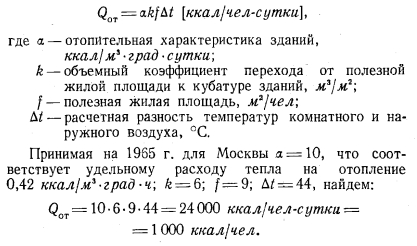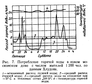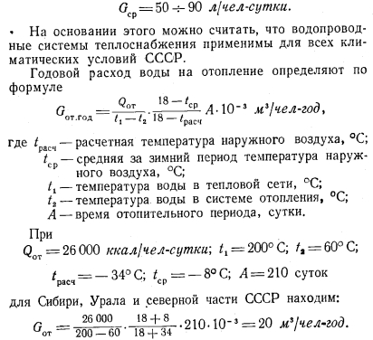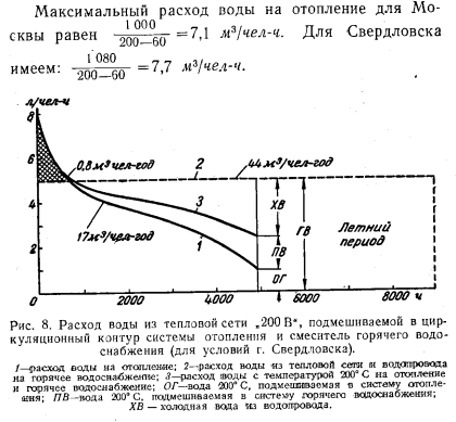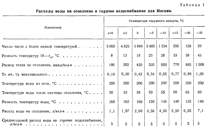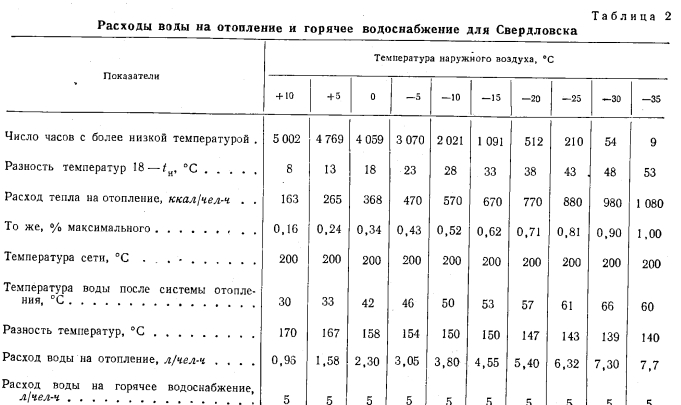 ОСОБЕННОСТИ ТЕПЛОФИКАЦИИ С ОДНОТРУБНЫМИ ТЕПЛОВЫМИ СЕТЯМИА. Соотношение тепловых нагрузок на отопление и горячее водоснабжение для различных климатических условий Практика использования горячей воды в новых домах (рис. 7) заставляет применять нормы расхода горячей воды (65° С) до 150 л/чел-сутки, т. е. такую же, как и для гостиниц, все номера которых имеют ванны. Институт генплана Москвы и Мосэнергопроект рекомендуют расчетную норму расхода горячей водм при температуре 60° С 120 л/чел-сутки, соответствующую расходу тепла на горячее водоснабжение 7 200 ккал/чел-сутки. ![]() Расход тепла на отопление, планируемый на 1965 г., составляет 24 000 ккал/чел-сутки. Это соответствует доле нагрузки горячего водоснабжения 23% общего суточного максимума расхода тепла на отопление и горячее водоснабжение. При такой нагрузке горячего водоснабжения общая максимальная часовая нагрузка на отопление и горячее водоснабжение принимается равной 1 720 ккал/чел-ч. Норма расхода горячей воды 120 л/чел-сутки соответствует количеству воды за год 120 - 365=44 м3/чел-год. За отопительный сезон, продолжающийся для Москвы 189 суток, имеем расход горячей воды 120 189 = = 23 мг/чел за отопительный сезон. Часовая нагрузка горячего водоснабжения в среднем за сутки составляет ~24~=5 л/чел-ч. Годовой расход тепла на отопление при числе часов использования максимума нагрузки, равном 2 500, находится из расчета 1 ООО 2 500 10-6 = 2,5 Гкал/год. Как показывает годовой график расходов воды на отопление (рис. 1), построенный для Москвы по климатическим данным, приведенным в табл. 1, количество воды, необходимое для отопления, почти весь зимний период меньше количества воды на горячее водоснабжение. Площади abсde определяют зимний расход воды на отопление (15 м3/чел-год) площадь kfde показывает зимний расход воды на горячее водоснабжение (25 м3/чел-год); площади abk дают наглядное представление о незначительности слива воды (для Москвы 0,7 м3/чел-год) с температурой ниже —15°С. Площадь flJnd (19 м3/чел-год) показывает летний расход воды на горячее водоснабжение. Общий годовой расход воды на горячее водоснабжение 44 м3/чел-год. Пиковый расход воды на отопление очень мал по сравнению с расходом воды на горячее водоснабжение. Площади bfc определяют количество воды, поступающей в систему горячего водоснабжения в виде смеси, взятой из тепловой сети и водопровода. Количество воды из водопровода можно уменьшить, переходя в этой части графика на качественное регулирование со среднесуточным расходом воды 5 л/чел-ч. На рис. 8 приводится график расхода воды на отопление для Сибири, Урала и Северной Европейской части СССР, составленный по климатическим данным для г. Свердловска (табл. 2). Из этого графика видно, что водопроводная система теплоснабжения применима и для суровых сибирских условий с такими же показателями, экономичности, как и в Москве, так как сливы воды из системы отопления в канализацию (0,8 м3/чел-год) при пиковой отопительной нагрузке получаются лишь незначительно большими, чем для Москвы. ![]() ![]() ![]() Роль слива воды по годовым графикам совершенно незначительна, и поэтому ошибочно придавать ему решающее значение [Л. 10J. При отсутствии баков-аккумуляторов у потребителя в ночное время возможны сливы воды до 10—20%. Если эти сливы будут пр одолжаться в течение 6 ч ночного времени, то за сутки они могут достигнуть величины 25%, Максимальное по