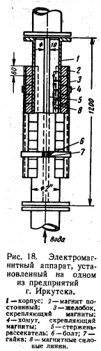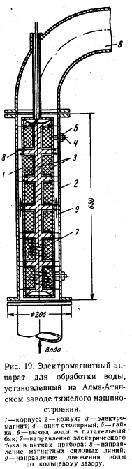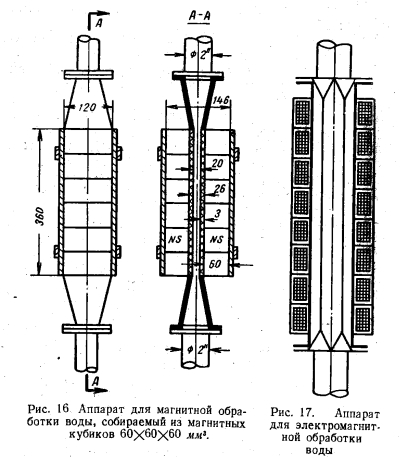 ПОДГОТОВКА ВОДЫ ДЛЯ ОДНОТРУБНЫХ ТЕПЛОВЫХ СЕТЕЙВоду для тепловых сетей 200 В» целесообразно брать непосредственно из открытых местных водоемов. Загрязненную воду при этом необходимо осветлять, пропускать через магнитные аппараты и деаэрировать. В некоторых случаях необходимы только осветление и деаэрация. Иногда может появиться необходимость в умягчении водопроводной воды. Образование трудноотделяемой накипи на стенках котлов при магнитной обработке воды прекращается или резко сокращается. Высокими магнитными свойствами обладает сплав магнико (14%Ni, 24%Со, 8%А1, 3%Си и 51%Fe), который имеет исключительно высокую коэрцитивную силу 600 э и остаточную индуктивность до 12,5 тыс. гс. Магниты из такого сплава готовятся методом литья или порошковой металлургии. Конструкции магнитных и электромагнитных аппаратов показаны на рис. 16 и 17. ![]() Самый простой аппарат собирается из магнитных кубиков 60X60X60 мм3. Расчет приборов для обработки воды магнитным полем, работающих на переменном однофазном токе напряжением 220 в с частотой 50 гц, приводится в табл. 3 и 4. ![]() Советскими исследователями было установлено, что магнитное поле оказывает ориентировочное действие на молекулы и способствует образованию центров кристаллизации. В результате исследований кристаллизации органических веществ в магнитном поле установили, что магнитное поле, не влияя на скорость кристаллизации, увеличивает число ее центров пропорционально напряжению магнитного поля. Изобретатель магнитного прибора для предупреждения накипи бельгийский инженер Верманерен отмечает, что при прохождении воды через магнитное поле происходит деформация находящихся в воде ионов солей жесткости с нарушением их зарядов, что в свою очередь ведет к нарушению электрического притяжения между ионами. Условия кристаллизации изменяются. Кальций, из которого в основном образуется твердое отложение накипи, переходит в кристаллическую модификацию углекислого кальция, который выпадает в виде рыхлого шлама. Наиболее известны магнитные приборы, выпускаемые бельгийской фирмой ЭПЮРО по патенту Вермайерена СЕР-1 и др. Магниты заключены в герметически закрытую трубу из антимагнитного металла. Такая труба с магнитами вставляется на фланцах в питательный трубопровод, в котором она омывается водой, проходящей последовательно ряд магнитных полей, под прямым углом к силовым магнитным линиям. Один из магнитных приборов прошел испытание во Всесоюзном теплотехническом институте имени Ф. Э. Дзержинского. ![]() ![]() Вода пропускалась по двум трубкам, обогреваемым паром в специальной паровой рубашке. По одной трубке проходила вода, предварительно обработанная в магнитном приборе, а по второй трубке пропускалась такая же вода без какой-либо обработки. Степень нагрева трубок колебалась от 50 до 60° С при работе на воде Терновского водохранилища и от 80 до 90° С — на воде Московского водохранилища. Опыт длился в течение 1000 ч. Результаты испытания показали, что толщина накипи на стенках котлов, работающих на воде Терновского водохранилища, после магнитной обработки уменьшилась до 0,15 мм против 0,28 мм до обработки. В котлах же, работающих на воде Московского водохранилища, после магнитной обработки воды накипь отсутствовала, в то время как до обработки ее слой имел толщину 1,25 мм. Накипь, полученная после обработки вод