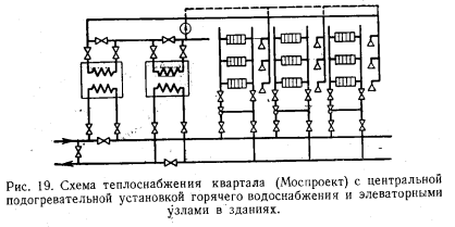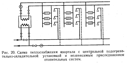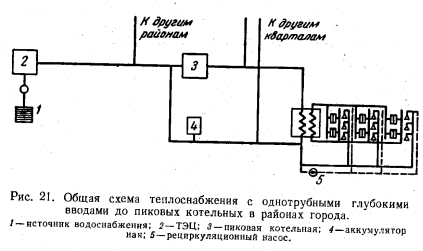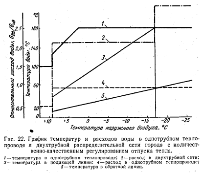 ВЛИЯНИЕ ОДНОТРУБНОГО ПИТАНИЯ ГОРОДСКИХ СЕТЕЙ НА ИХ ХАРАКТЕРИСТИКИНаличие однотрубных вводов в город и его районы сказывается на конфигурации и характеристиках внутригородских и внутрирайонных тепловых сетей, которые в данном случае остаются двухтрубными (с непосредственным водоразбором). До настоящего времени такие двухтрубные сети проектируются, как правило, с элеваторным присоединением отопительных потребителей. Это вынуждает независимо от экономической целесообразности ограничивать высшую температуру воды в тепловой сети 150° С, хотя уже при такой температуре из-за повышенного коэффициента смешения элеваторных узлов приходится предусматривать большие напоры на вводах (до 12—18 м). Повышение напоров приводит к снижению эффективности схемы, так как означает перерасход электроэнергии на перекачку теплоносителя. Отсюда возникли различные предложения о присоединении последних» потребителей сети по независимой схеме, через теплообменники или через смесительные насосные узлы. Трудность заключается в определении понятия последних» потребителей, так как в правильно рассчитанной идеальной тепловой сети все напоры гасятся соответствующим выбором диаметром магистралей и ответвлений и по этой причине любой потребитель может рассматриваться как последний. Кроме того, происходит изменение конфигурации сети при присоединении дополнительных потребителей, часто не предусмотренных проектом. Несомненно, что ограничение температуры воды величиной 150° С не сказывается на экономике двухтрубных сетей при питании их от турбин типа ВТ, для которых верхний предел нагрева воды не превосходит 110—115° С. Иначе обстоит дело в случае ввода в район магистрали с температурой воды 180° С, что вызывается условиями однотрубного транспорта тепла. Необходимо в таких случаях выяснить, что целесообразнее: температура воды сети не выше 150° С с сохранением схемы элеваторного присоединения или повышение температуры до 180° С -с переходом на независимое или насосное присоединение. Первое решение дает более дешевые вводы, второе — более дешевые сети. Для района с нагрузкой 200 Гкал/ч теоретическое снижение затрат на тепловые сети составит в этом случае 1 800 руб) Г к ал. Современные домовые элеваторные отопительные вводы, как известно, обходятся примерно в такую же сумму. Таким образом, повышение температуры воды будет целесообразно в тех случаях, когда усложнение ввода, вызванное таким повышением, не превышает по затратам стоимость обычного ввода. Можно считать, что одно это обстоятельство может привести к более широкому переводу внутрирайонных сетей на температуру воды 180° С при наличии однотрубного ввода в район. Однако этим не ограничивается влияние схемы ввода в район. Действительно, при переходе на независимое присоединение отопительных нагрузок отпадает наиболее сложный вопрос о необходимости сохранения постоянства расхода воды на вводах. Схемы с независимо мыми вводами в значительно большей мере пригодны для осуществления количественно-качественного регулирования. Итак, наличие однотрубных вводов способствует снижению затрат на двухтрубные внутрирайонные сети и переходу на независимые отопительные вводы. Это в значительной мере облегчает задачу перехода на однотрубные вводы в тех городах, где тепловые сети выполнены двухтру