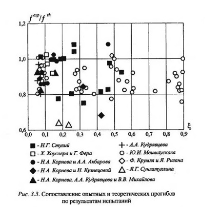 ДеформацииПри расчете по деформациям предлагается приводить многослойные железобетонные сечения с монолитной связью слоев к тавровому (для двухслойных) или двутавровому (для трехслойных), исходя из отношения начальных модулей упругости бетонов слоев с целью использования гипотезы плоских сечений как для обычных железобетонных элементов. И.Д. Передериенко констатирует, что трехслойные элементы имеют меньшую жесткость по сравнению с однослойными В.И. Майоровым получены меньшие расчетные значения жесткости и прогибов, чем фактические. Причем расхождения увеличиваются с ростом процента армирования и нагрузки. Анализируя полученные различия в стадии после образования трещин, этот автор пришел к мнению, что причина находится в отличии между нормируемым значением v = 0,5 и определенным по результатам его исследований v = 0,3. При корректировке коэффициента v теоретические значения прогибов незначительно отличались от опытных. Однако экспериментальные значения других коэффициентов в этих исследованиях не были получены. Выполненное Ю. И. Мешкаускасом обобщение экспериментальных дан ных различных авторов по фактическим прогибам 44 двухслойных и 37 трехслойных элементов и конструкций и сопоставление их с теоретическими вы явило, что различие между ними в среднем составляет 10% (рис 3.3). Это подтверждает возможность использования предлагаемого подхода при расчете многослойных железобетонных элементов монолитного сечения по деформациям.