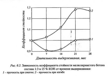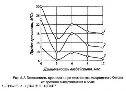 Рассмотрим эффекты уплотнения и упрочнения цементных бетонов при действии наиболее распространенных агрессивных сред: воды, слабых растворов неорганических кислот, щелочей. В результате воздействия воды на цементные бетоны возможны следующие физические, физико-химические и химические процессы, приводящие к снижению их прочности: растворение и вымывание компонентов связующего вещества, гидролиз структурообразующих связей, адсорбционное понижение прочности и пластификация связующего, обводнение и нарушение контакта связующих веществ с заполнителями. Вместе с тем на примере цементных бетонов можно наглядно убедиться в том, что при действии на них воды возникают и процессы, направленные на уплотнение и упрочнение материала. Из рис. 6.1 видно, что изменения показателя прочности мелкозернистых цементных бетонов при выдержке в воде имеют экстремальные точки. Это говорит о том, что при действии воды на материал протекают два вида взаимно противоположных по влиянию на прочность процессов. Одни из них приводят к ее снижению, другие способствуют повышению благодаря росту новообразований, уменьшению дефектности и неравномерности, распределению внутренних напряжений и т.д.