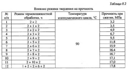 При определении влияния длительности изотермического прогрева на интенсивность нарастания прочности установлено, что для получения бетонов с максимальными прочностными показа елями оптимальное время изотермического выдерживания составляет 6 ч. При его увеличении до 10 ч прочность повышается всего на 6,5%. Длительный прогрев посте максимального упрочнения нецелесообразен так как это усиливает рекристаллизационные процессы, вызывающие падение прочности. Интенсификация процессов структурообразования стеклощелочных систем при их нагреве до 40 С и последующем выдерживании до зарождения кристаллического каркаса позволяет улучшить структуру и повысить прочность бетонов, подвергаемых термовлажностной обработке по ступенчатому режиму, при котором сначала поднимают температуру среды до 30-40 С выдерживают изделия 1,5-2 ч до набора прочности достаточной для преодоления внутренних напряжений, возникающих в бетоне при нагреве режим термовлажностной обработки № 12 в табл. 8.2, затем поднимают температуру до 80-90 С в течение 1,5 -2 ч для полного прогрева бетона выдерживают его в течение 6 ч и снижают температуру до нормальной в течение 2 ч. Такой режим способствует уменьшению деструктивных процессов на первой стадии термовлажностной обработки, обеспечивает увеличение объема мелкокристаллических гидратных фаз и уплотняет структуру материала. Применение ступенчатого режима позволяет сократить время предварительного выдерживания перед термовлажностной обработкой. |
