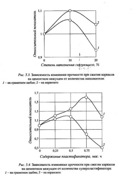 Исследование каркасов на цементных связующихВ трехслойных изделиях на основе каркасных бетонов средний слой представляет собой каркас - крупнопористый ёетон, составленный из склеенных зерен крупного заполнителя. Свойства крупнопористого бетона (каркаса) во многом определяют свойства всего каркасного композита в целом. Крупнопористые бетоны имеют довольно широкое применение в строительстве. В настоящее время в их изучении накоплен значительный материал установлены основные закономерности структурообразования, изучены основные физико- тсхнические свойства, разработана технология изготовления бетонов и строительных изделий на их основе. В трехслойных конструкциях на основе каркасных бетонов наиболее эффективным с точки зрения получения изделий является применение цементных связующих. Прочность каркаса в изделиях определяется количественным содержанием и прочностью клея. Нами установлено, что прочностные свойства каркасов можно улучшить за счет добавления в клеевой состав микронаполнителя При его введении увеличивается толщина оболочки цементного камня на зернах заполнителя. В качестве таких добавок эффективно использование ОПФ шлаков» зол, отходов обогащения удобрений и т.д. Нами проведены исследования прочностных свойств каркасов на портландцементе марки 400 Алексеевского цементного завода с применением микронаполнителей, в качестве которых применялся стеклобой - отход производства ОАО «Лисма». Содержание добавки варьировалось от 0 до 20% от массы связующего. В результате испытания образцов, составленных на керамзите и гранитном щебне фракции 5-10 мм, установлено, что введение микронаполнителя способствует повышению прочности каркасов в 1,1 и 1,06 раза соответственно при замене 10% цемента порошком стеклобоя (рис, 5.3). В то же время применение данной добавки приводит к увеличению водосодержания смеси, что можно исключить при введении пластификаторов или полимерных добавок. С целью выявления зависимости свойств каркасов на цементном связующем от количественного содержания пластификатора и полимерной добавки были проведены испытания образцов на керамзите и гранитном щебне. В качестве пластификатора применялся суперпластификатор С-3, а полимерной добавки - поливинилацетатная эмульсия. Пластификатор вводился в количестве 0,25; 0,50, 0,75 и 1,0 мас. ч на 100 мас. ч. вяжущего.