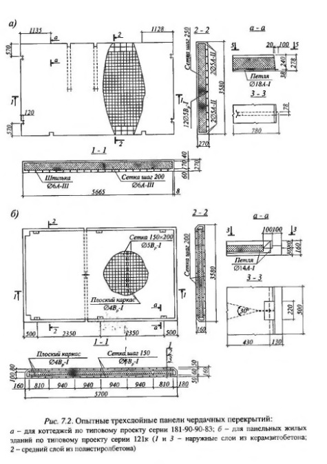 Изготовление опытных конструкцийДля экспериментальных исследований по рабочим чертежам изготовлены натурные конструкции, включая панели ленточной разрезки с наружными слоями из тяжелого бетона (ПСЛТ 1,2) и шлакопемзобетона (ПСЛШ 1,2), укрупненные стеновые панели для животноводческих зданий, стеновые панели и панели чердачных перекрытии для жилых здании с наружными слоями из керамзитобетона (ПП-12), модели и фрагменты панелей ленточной разрезки (ПСЛТ 1м, 2м); фрагменты панелей вертикальной разрезки (плоские и с ребрами) (ПСТ 1,2,3) и элементов стыков стеновых панелей жилых зданий (СК 1,2; СП-12). Все опытные конструкции изготовлены в количестве двух образцов каждого наименования. Натурные конструкции и их модели предназначены для испытаний в соответствии с реальной схемой их работы в здании, а фрагменты - для проверки анкеровки закладных деталей, петель и других элементов конструкций.