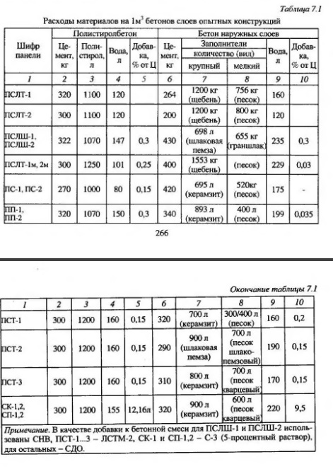 Большинство опытных конструкции изготовлено на заводах с использованием имеющегося парка форм. Для соблюдения проектных размеров слоев на бортах опалубки предназначенной для однослойных конструкций цветной краской наносили полосы, соответствующие толщинам слоев. Последовательность изготовления всех панелей аналогична. Первым этапом в подготовленные формы укладывают арматуру, затем конструкционный бетон нижнего слоя и полистиролбетон среднего слоя, уплотняя каждый на вибростоле в течение 30. .40 с После этого укладывают конструкционный бетон верхнего слоя с уплотнением на вибростоле не более 15...20 с. для предотвращения перемешивания его со средним слоем. Перерывы между укладкой смежных слоев составляли не более 15...20 мин. После формования и 5-часовой выдержки изделия пропаривают в ямных камерах по режиму подъем температуры - 3, изотермическая выдержка при температуре 60°С - 10 и остывание - 2 часа. При изготовлении всех конструкций в качестве заполнителя полистиролбетона использован вспененный полистирот фракций 5...10 и 10...20 мм насыпной плотностью 25...42 кг/м3. Для бетонов наружных слоев применен крупный заполнитель различных видов, для тяжелого бетона - гранитныи щебень крупностью до 5 мм, для керамзитобетона - керамзитовый гравий фракции 5...10 мм насыпной плотностью 650...750 кг/м и прочностью при сдавливании в цилиндре 1,8...2,9 МПа и для шлакопемзобетона - шлаковая пемза фракций 5...10 мм насыпной плотностью 707 кг/м и прочностью при сдавливании в цилиндре 1,5 МПа. Мелким заполнителем служил кварцевый песок с модулем крупности 1,5...1,8 насыпной плотностью 1250...1510 кг/м и гран-шлак. В качестве вяжущего всех бетонов использован портландцемент марки 400 (за исключением шлакопортландцемента марки 300 для шлакопемзобетона). Расходы материалов на 1 м бетонов слоев для изготовленных конструкций приведены в табл 7.1.