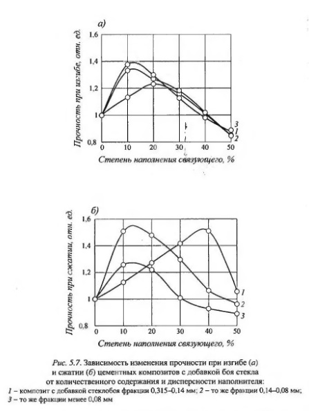 С целью установления структурных изменений, происходящих в композитах, наполненных стеклобоем, были проведены рентгеноструктурные исследования, заключающиеся в их анализе на рентгеновском дифрактометре «Дрон-3М» с ионизационной регистрацией интенсивности рентгеновских лучей. Применялась фокусировка по Бреггу-Брентано. Результаты фиксировались на самописце со скоростью движения диаграммной ленты 720 мм/ч. Положение рентгеновских рефлексов определялось по максимумам интенсивности. В качестве контрольного образца рассматривался чистый цементный камень с межплоскостными расстояниями 0,720; 0,636; 0,489; 0,385; 0,334; 0,302; 0,273; 0,261, 0,218; 0,198; 0,1916; 0,182,0,1794; 0,166; 0,1622; 0,154; 0,1483 нм. Взятый для исследования стеклобой характеризуется следующими межшюскостными расстояниями 0,425; 0,334; 0,303,0,1908,0,1816 нм. В результате исследований составов с наполнителем было установлено, что появился отдельный рефлекс d = 0,357 нм (рис. 5.6). Было также вывлено, что введение боя стекла способствует увеличению степени гидратации на 60%. Результаты исследований показали что введение в связующее порошка стеклобоя увеличивает сроки схватывания цементного теста, причем его замедление в большей степени происходит при наполнении более 50%. Введение стеклобоя приводит к изменению нормальной Густоты цементного теста. Данный наполнитель за счет повышенной пленочной влагоемкости, которая приводит к поглощению и удержанию влаги на поверхности частиц, увеличивает водопотребность цементного теста. Влияние стеклобоя на прочность цементных композитов исследовалось на составах, содержащих связующее, наполнитель и воду. Дисперсность наполнителя варьировалась от 1000 до 4500 см2/г, а степень наполнения - в пределах от 10 до 50% от массы связующего. Изготавливались образцы размером 1x1x3 и 2x2x2 см, которые отверждались сначала в течение суток в нормальных температурно-влажностных условиях, а затем в условиях термовлажностной обработки при температуре 86°С с режимом прогрева 1,5+6,0+1,5 ч и испытывались на изгиб и сжатие. Анализ экспериментальных данных показывает, что, изменяя дисперсность наполнителя и степень наполнения связующего, можно в широких пределах регулировать прочностные свойства цементного камня (рис. 5,7) Оптимальная степень наполнения связующего для композитов с добавкой боя стекла составляет 10-20%. Максимальная прочность при этом достигается при крупности зерен 0,14-0,08 мм. Зависимость прочности цементных связующих с микронаполнителями от степени наполнения имеет экстремальный характер, который объясняется с позиций кластерообразования В зоне метастабильных состояний наблюдается резкое повышение прочностных показателей, которые достигают максимума при оптимальной степени наполнения. При дальнейшем увеличении прочность композитов снижается вследствие неоднородности структуры. В качестве наполнителей для цементных композитов были использованы и местные сырьевые материалы: диатомит Атемарского месторождения и известняк Ельниковского карьера Республики Мордовия. Полученные данные свидетельствуют о том, что диатомитом можно заменить до 10% цемента без ущерба для прочности композиций. Исследование наполненных материалов с применением молотого известняка показало, что известняк принадлежит к типу наполнителей, обладающих пластифицирующими свойствами по отношению к бетонной 