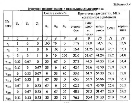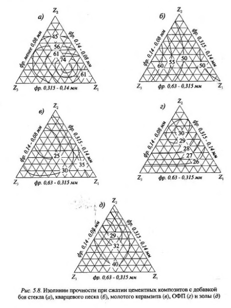 Наполнитель по эффективности структурообразования разделяется на три степени дисперсности высокодисперсный наполнитель, удельная поверхность которого значительно выше, чем у вяжущею, увеличивающего прочность за счет повышения однородности пор по размеру; наполнитель, удельная поверхность которого близка к дисперсности вяжущего который играет роль подложки в процессе формирования структуры; наполнитель с грубодисперсной структурой, который играет роль компенсатора деформаций внутри структуры бетонов. Из данной классификации следует, что совмещение наполнителей различной дисперсности способствует получению композитов с улучшенными свойствами по сравнению с материалами на однофракционных наполнителях. При исследовании композитов, наполненных порошками, состоящими из смеси частиц различного гранулометричсского состава, наполнителями служили порошки кварцевого песка, керамзита, отходов стекла Саранского электролампового завода, отработанный формовочный песок (ОФП) Саранского завода «Центролит» и зола ТЭЦ. Оптимизационные исследования выполнялись с помощью математических методов планирования эксперимента. Гранулометрический состав наполнителя варьировался на трех уровнях: 0,63-0,315 мм - Xi, 0,315-0,14 мм - Х2, менее 0,14 мм - Х3 для кварцевого песка, молотого керамзита, ОФП и золы; 0,315-0,14 мм - Хь 0,14-0,08 мм - Х2, менее 0,08 мм - Х3 для стеклобоя. Исследованию подвергалась диаграмма «состав - свойство» с вершинами: Z1 (X, = 100%, Х2 = 0%); Z2 (Х2 = 100%, Х3 = 0%); Z3 (Х3 = 100%, X, = 0%). Матрица планирования для трехкомпонентной системы и результаты эксперимента приведены в табл. 5.4.