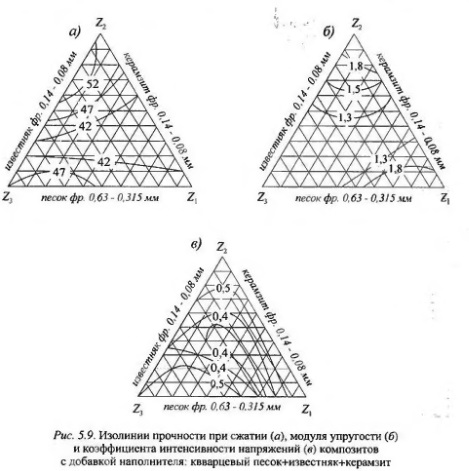 При выполнении исследований в качестве такого наполнителя рассмат ривалась смесь часгиц кварцевого песка, молотого керамзита и известняка. Оптимизационные исследования проводились с помощью математических методов планирования эксперимента. В качестве варьируемых факторов были выбраны типы наполнителей: X1 - кварцевый песок фракции 0,63-0,315 мм; Х2 - керамзит фракции 0,14-0,08 мм и Х3 - известняк фракции 0,14-0,08 мм. Оптимизационными параметрами служили прочность композитов при сжатии, модуль упругости и трещиностойкость, которая оценивалась коэффициентом К, Статистическая обработка результатов эксперимента позволила получить зависимости прочности при сжатии цементных композитов от вида и гранулометрического состава наполнителей. По уравнениям были построены графики в виде линий равных значений прочности, которые представлены на рис. 5.9.