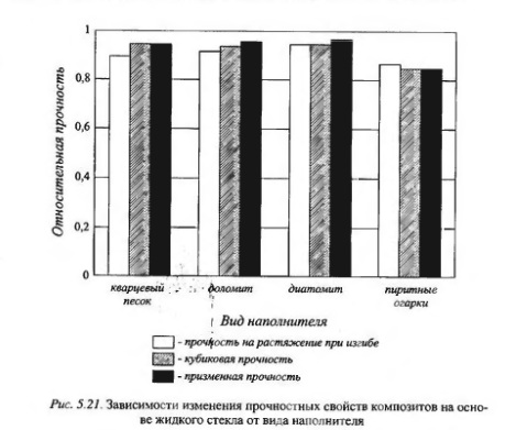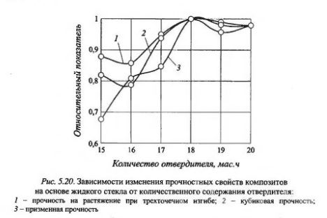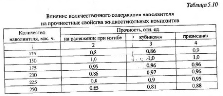 Прочность наполненных композиционных материалов на основе жидкого стекла, как и других композитор, определяется многими факторами, непосредственно прочностью связующего и наполнителя, соотношением их прочностных свойств, степенью адгезионного взаимодействия между связующим и наполнителем и т.д. Жидкое стекло обладает высокой реакционной способностью, и введение в жидкостскольную систему в значительных количествах тех или иных наполнителей почти всегда отражается на кинетике отверждения. Не так просто найти вещества, которые были бы инертны по отношению к жидкому стеклу. Поэтому рецептуру той или иной системы необходимо отрабатывать сразу по всей совокупности свойств как до отверждения, так и после него. Проведенными исследованиями установлено влияние количественного содержания наполнителя - кварцевого песка крупностью 0,14-0,315 мм на прочностные свойства жидкостекольных композитов. Результаты испытаний образцов приведены в табл. 5.10. Как видно из табл. 5.10, наилучшим составом является состав с содержанием наполнителя 150 мас. ч. на 100 мас. ч. жидкого стекла. Видимо, это объясняется тем, что при его увеличении до 250 мас. ч. на 100 мас. ч. вяжущего последнего не хватает на полное обволакивание всех частиц дисперсного наполнителя. Вследствие образовавшихся пор прочность материала снижается.