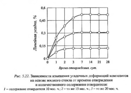 Долговечность микроструктуры можно повысить путем специального подбора вяжущего и наполнителей, т.е. при условии физико-химической активности наполнителя по отношению к вяжущему. С целью определения физико-механических свойств жидкостекольных композитов на различных наполнителях были изготовлены образцы-балочки размером 1x1x3 см. В качестве наполнителей использовались порошки кварцевого песка, доломита, диатомита, пиритных огарков. Количество наполнителя принималось из условия получения равноподвижных композиций. Результаты испытаний представлены на рис. 5.21. Анализ результатов исследований свидетельствует о том, что типом выбранного наполнителя возможно целенаправленно в широких пределах регулировать свойства жидкостекольных композитов. Наилучшими прочностными свойствами обладают композиции, наполненные порошками кварца, доломита и диатомита, а худшие показатели характерны для композитов с пиритными огарками. Композиционные материалы на жидком стекле (силикатные системы) имеют довольно большую усадку при твердении, чего нельзя сказать о полимерсиликатных системах, усадка которых в 2-3 раза ниже, чем у первых. В связи с этим были проведены исследования, направленные на уменьшение усадочных напряжений жидкостекольных композиций при твердении. Усадочные деформации определялись с помощью индикаторов часового типа по общепринятой методике на образцах размером 4x4x16 см, твердеющих в нормальных температурно-влажностных условиях. При этом изучено влияние вида и количества наполнителя, а также количества отвердителя. Все составы после приготовления выдерживались в формах в течение суток, затем образцы устанавливались на индикаторные стойки. Показания снимались в течение 28 суток. Кинетика изменения усадочных деформаций композитов на основе жидкого стекла при различном содержании отвердителя приведена на рис. 5.22. Из графика видно, что наименьшей усадкой характеризуется композит с содержанием отвердителя 20 мас. ч. на 100 мас. ч. жидкого стекла. При уменьшении количества отвердителя усадка жидкостекольных композитов увеличивается. Видимо, это объясняется тем, что при малом содержании кремиефтористого натрия вяжущее - жидкое стекло - в композите находится в избытке. Вследствие этого при твердении некоторое количество жидкого стекла остается в несвязанном состоянии и в дальнейшем (уже после окончательного затвердевания композиции) в жидкостекольном составе остаются поры от высыхания воды. Из-за увеличивающейся пористости увеличивается и усадка.