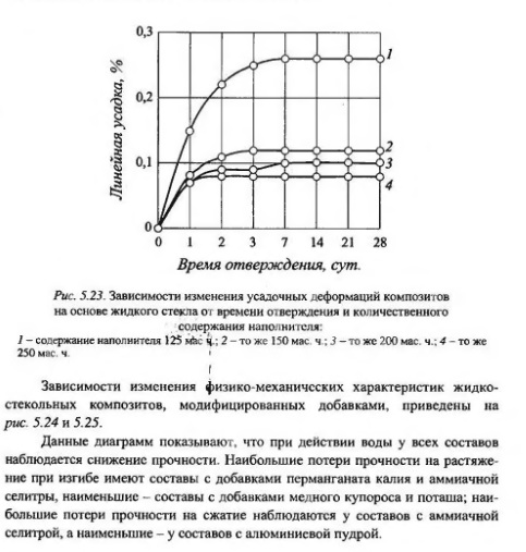 Из графика видно, что наименьшую усадку испытывает композит с содержанием наполнителя 150 мас. ч. на 100 мас. ч. жидкого стекла и 20 мас. ч. кремнефтористого натрия. При уменьшении количества наполнителя усадка жидкостекольных композитов увеличивается. Вероятно, это объясняется тем, что при обволакивании жидким стеклом частиц наполнителя вследствие малого содержания последнего вокруг каждой частицы образуется пленка вяжущего слишком большой толщины, в результате при окончательном затвердевании некоторое количество жидкого стекла оказывается в несвязанном состоянии. В дальнейшем в жидкостекольном составе появляются поры от испаряющейся воды. Из-за увеличивающейся пористости растет и усадка. При увеличении же содержания наполнителя до 200 мас. ч. и выше на 100 мас. ч. вяжущего, наоборот, последнего не хватает на полное обволакивание частиц наполнителя. Из-за этого, а также из-за большой его суммарной поверхности не все частицы кварцевого песка оказываются покрытыми жидкий стеклом (или все покрыты, но тонкой пленкой). Структура композита становится уплотненной еще на начальной стадии твердения. Поэтому в высоконаполненных составах не наблюдается большой усадки.