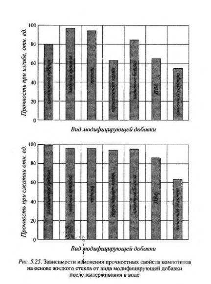 Одной из предпосылок надежной работы конструкций из полимерсиликатного бетона, особенно наливных сооружений, является его плотность и непроницаемость. С этой целью в состав композитов на жидком стекле вводят модифицирующие добавки различной природы. В качестве перспективной модифицирующей добавки для создания кислотоупорных композиционных материалов на жидком стекле предложены технические лигносульфонаты, введением низкомолекулярного полиэтилена, фурфурилового спирта и кремнефтористого натрия в полимерсиликатную композицию можно повысить плотность последней; комплексная добавка, состоящая из мочевиноформальдегидной смолы, необожженной и обожженной гидратированной слюды, окиси цинка и дициандиамида, позволяет повысить огнестойкость жидкостекольных композиций; увеличить долговечность композиций для изготовления теплоизоляционных покрытий можно введением в последнюю комплексной добавки, включающей жидкое стекло, асбест и кварцевый песок.