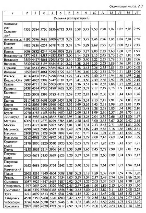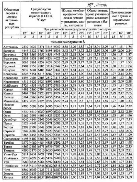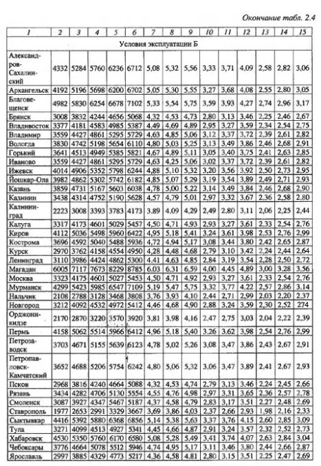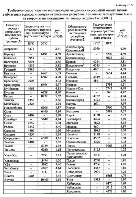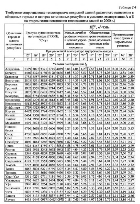 Определение требуемого сопротивления теплопередаче стен, покрытий и чердачных перекрытий зданий и помещений различного назначенияНа втором этапе требования к величине приведенного сопротивления теплопередаче стен, покрытий и чердачных перекрытии приведены в табл 16 СНиП II-3 79 (Изменения № 3). Они зависят от назначения здания или помещения и величины градусов суток отопительного периода (ГСОП, °С сут). Анализ перспективных направлений применения разработанных трех слойных панелей стен, покрытий и чердачных перекрытий с наружными слоями из конструкционных бетонов и средним - из низкотеплопроводных легких бетонов проведен для основных типов зданий и помещений, находящихся в различных климатических условиях. Рассмотрены все областные города России и центры автономных республик общим числом 71, включенные в СНиП 2 0101 82 «Строитетьная климатология и геофизика», среди которых 34 расположены в условиях эксплуатации А, а 37 - в условиях эксплуатации Б (в таблицах сохранены наименования городов, принятые в СНиП). Для них определены величины ГСОП при различной расчетной температуре внутреннего воздуха и требуемое сопротивление теплопередаче ограждающих конструкций зданий различного назначения (табл. 2.3, 2.4, 2.5). Наиболее высокие требования по теплозащите предъявляются к жилым зданиям, лечебно-профилактическим и детским учреждениям, школам и интернатам. Приведенное сопротивление теплопередаче ограждающих конструкций этих зданий определено для расчетной температуры внутреннего воздуха 18, 20 и 22°С. Согласно требованиям СНиП 2.08.01-85. «Жилые здания» в районах с температурой наиболее холодной пятидневки выше -31°С расчетная температура в жилых комнатах принимается равной 18°С, а с температурой -31°С и ниже -20°С. Для городов, расположенных в условиях эксплуатации А, величины ГСОП при расчетной температуре внутреннего воздуха 18, 20, 22°С соответственно составляют 2325 (Махачкала)...9957 (Якутск), 2627...10465, 2929...10973, а требуемое на втором этапе теплозащиты зданий приведенное сопротивление теплопередаче стен соответственно 2,21...4,88, 2,32...5,06, 2,43 ..5,24 (табл 2.3), покрытий - 3,36 ,.7,18, 3,61...7,43, 3,66 .7,68 м2-°С/Вт (табл. 2.4). В условиях эксплуатации Б величины ГСОП при расчетной температуре внутреннего воздуха 18, 20, 22°С соответственно составляют 2991 (Ставрополь)...7673 (Магадан), 3329...8229, 3667...8785, а требуемое сопротивление теплопередаче стен соответственно - 2,45—4,08, 2,57...4,28, 2,68...4,47 (см. табл. 2.3), покрытий - 3,69...6,03, 3,86...6,31, 4,03...6,59 м2-°С/Вт (табл. 24). Для чердачных перекрытий жилых зданий величины ГСОП изменяются соответственно от 2325 (Махачкала) до 10465 (Якутск) в условиях эксплуатации А и от 2991 (Ставрополь) до 8229 (Магадан) в условиях эксплуатации Б, а требуемые значения приведенного сопротивления теплопередаче соответственно составляют 2,94..6,б1 и 3,24..5,35 м2 °С/Вт (табл. 2.5). Для общественных, кроме указанных выше, административных и бытовых зданий (за исключением помещений с влажным или мокрым режимом) при расчетной температуре внутреннего воздуха 12, 16 и 20°С величины ГСОП в условиях эксплуатации А составляют соответственно 1 419—8433, 2023...9449 и 2627... 10465, а требуемое сопротивление теплопередаче стен - 1,37...3,73; 1.61...4.04; 1,85...4,34, покрытий - 1,70...4,97; 2,41...5,38; 2,65...5,79 м2-°С/Вт (см. табл. 2.3, 2 4). В условиях эксплуатации Б при расчетной температуре внутреннего воздуха 12, 16 и 2*Ь°С величины ГСОП составляют соответственно 1977.. .6006, 2653.