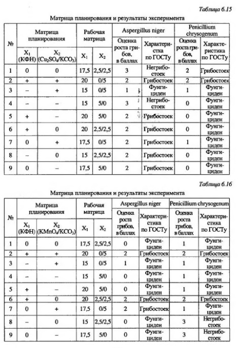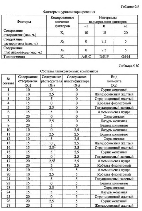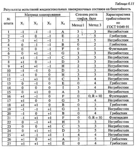 Оптимизация окрасочных составов на основе жидкостекольных связующих для антикоррозионной защитыСреди большого разнообразия различных видов лакокрасочных материалов в отдельных зданиях и сооружениях достаточно эффективно применение жидкостекольных материалов, которые имеют пониженную стоимость по сравнению с полимерными материалами. Долговечная работа лакокрасочных покрытий определяется способностью материала сопротивляться воздействию химически и биологически агрессивных сред. Важнейшим составляющим компонентом окрасочных составов, влияющих на долговечность покрытий, являются пигменты, которые придают необходимый цвет лакокрасочным покрытиям. Нами проведены исследования биологического сопротивления лакокрасочных жидкостекольных композитов, а также их физико-механических характеристик. Исследования выполнены с применением методов математического планирования экспериментов. В качестве матрицы планирования эксперимента был использован латинский куб второго порядка. Этот план представляет собой полный факторный эксперимент 3 , разбитый на девять блоков по три опыта в каждом Факторами варьирования при выполнении эксперимента были приняты: содержание отвердителя - кремнефтористого натрия (X1), содержание растворителя - воды (Х2), содержание пластификатора - поливинилацетатной эмульсии (Х3), тип пигмента (Х4) (табл. 6.9). В качестве пигментов использовались: А - сурик железный, В - кобальт фиолетовый, С - охра светлая, D - лазурь железная, Е - железоокисный желтый, F - глауконитовый зеленый, G - алюминиевая пудра, Н - белила, I - стронциановый желтый. Количественное содержание рассматриваемых факторов принималось из учета на 100 маc. ч. жидкого стекла и 100 маc. ч. мела. Составы лакокрасочных композитов даны в табл. 6.10. Содержание пигмента в каждом опыте определено из условия обеспечения оптимальной цветовой окраски.