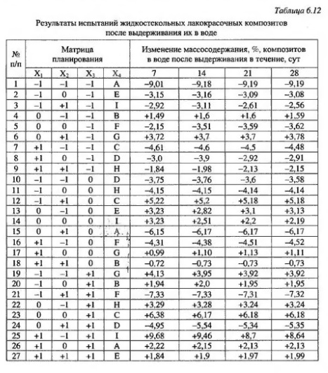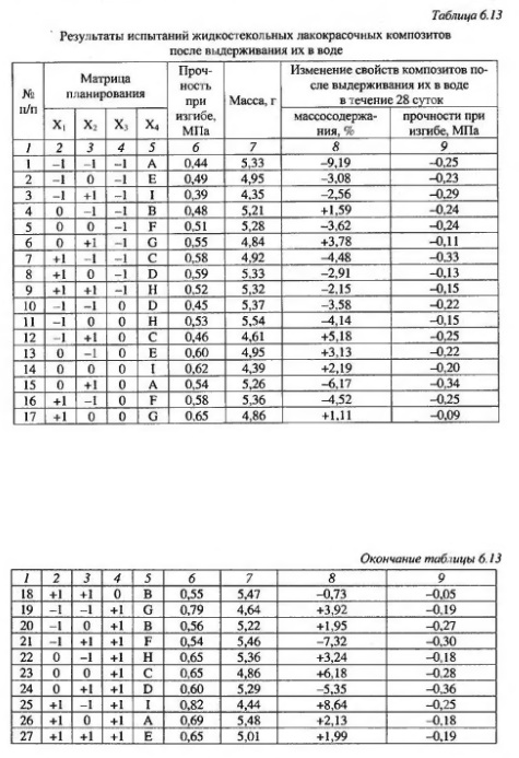 При исследовании химического сопротивления жидкостекольных лакокрасочных композитов основное внимание было уделено водостойкости, так как водостойкость является самой универсальной характеристикой для оценки химической стойкости жидкостекольных композитов. Вода, обладая высокой проникающей способностью и полярностью, способствует ослаблению и разрушению фрикционных, ван дер ваальсовых, водородных и гидролитически нестойких связей через катион металла. Матрица планирования эксперимента и результаты иссаедования водопоглощения лакокрасочных составов приведены в табл. 612 Показатель водопоглощения устанавливался путем определения изменения массосодержания образцов до и после погружения в воду, который определялся после 7, 14, 21 и 28 суток экспозиции образцов в воде при комнатной температуре.