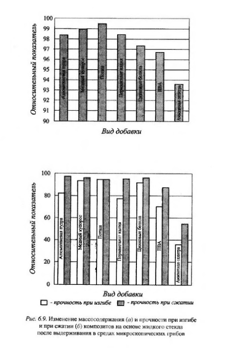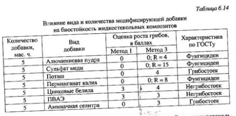 Результаты испытаний говорят о том, что прочность лакокрасочных композитов при действии воды уменьшается. Наибольшим изменениям прочности на растяжение при изгибе подвержены составы № 3,15 и 24 (соответственно со стронциановым желтым пигментом, суриком железным и лазурью железной), наименьшим - составы № 17 и 18 (соответственно с применением пигментов алюминиевой пудры и кобальта фиолетового). Наибольшие потери прочности на сжатие отмечены у составов с применением сурика железного, стронцианового желтого и глауконитового зеленого пигментов (составы № 1, 3 и 21), наименьшие - у составов № 6, 8, 18 (соответственно с алюминиевой пудрой, лазурью железной и кобальтом фиолетовым). Оценка биологического сопротивления композитов на основе жидкого стекла показала, что некоторые составы являются грибостойкими, но не фунгицидными. Поэтому в зданиях с биологически активными средами строительные материалы и изделия должны быть защищены от биоповреждений. С целью экспериментального исследования влияния фунгицидных добавок на биосопротивление композитов на основе жидкого стекла были рассмотрены различные добавки неорганической природы. Нами установлено, что введение сульфата меди, перманганата калия, алюминиевои пудры в состав жидкостекольных композитов делает последние фунгицидными. В качестве наполнителя в составах применялся кварцевый песок в количестве 150 мас. ч. на 100 мас. ч. жидкого стекла. Количество отвердителя было постоянным во всех со ставах - 20 мас. ч. на 100 мас. ч. вяжущего. Результаты исследований приведены в табл. 6. 14. Анализ данных табл. 6. 14 подтверждает тот факт что добавление модифицирующих добавок, содержащих соли тяжелых металлов, в композиты позволяет получать фунгицидные составы. В то же время введение поливинил-ацетатной эмульсии и цинковых белил (5 мас. ч. на 100 мас. ч. жидкого стекла) в составы жидкостекольных композитов не влияет на биологическую стойкость.