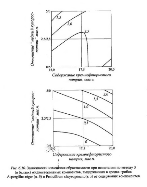 Рассматривая изменение физико-механических свойств жидкостекольных композитов, модифицированных добавками, следует отметить, что все составы после выдерживания в средах микроскопических грибов теряют массу и прочность (рис. 6.9). Наибольшие потери массы имеет состав с добавкой аммиачной селитры, наименьшие - с добавкой поташа. Прочность при изгибе и при сжатии больше всего теряется у составов с добавкой поливинилацетатной эмульсии и аммиачной селитры. Многолетние исследования в области биологической стойкости композиционных строительных материалов свидетельствуют о том, что из большого многообразия микроскопических организмов наибольший вред промышленным и строительным материалам, изделиям и конструкциям приносят мицелиальные грибы Aspergillus niger и Penicillium chrysogenum. Исходя из этого, нами была проведена оценка биостойкости жидкостекольных композитов в условиях воздействия данных видов грибов. Подбор фунгицидных составов жидкостекольных композитов осуществлялся с применением метода математического планирования эксперимента. Варьируемыми факторами в экспериментах были приняты содержание кремнефтористого натрия (X1) и отношения «медный купорос-поташ» и «перманганат калия-поташ» (Х2). Матрица планирования и результаты экспериментов приведены в табл. 6.15, 6.16 и на рис. 6.10. Как видно из результатов, композиты на основе жидкого стекла с добавкой медного купороса и поташа фунгицидны при действии гриба Penicillium chrysogenum, когда содержание данных добавок 2,5/2,5 мас. ч. на 20 мас. ч. кремнефтористого натрия и 100 мас. ч. жидкого стекла. Композиты на основе жидкого стекла с добавкой перманганата калия и поташа фунгицидны при действии гриба Aspergillus niger, когда содержание данных добавок находится в пределах от 5/0 мас. ч. на 15 мас. ч. отвердителя и 100 мас. ч. вяжущего до 0/5 мас. ч. на 20 мас. ч отвердителя и 100 мас. ч, вяжущего.