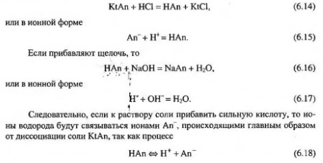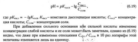 будет сильно подавлен из за воздействия на равновесие одноименных Аn ионов соли. При добавлении к раствору кислоты сильной щелочи ионы водорода соединяются с ионами гидроксила, образуя слабый электролит - воду, а израсходованные ионы Н* будут пополняться вследствие диссоциации кислоты. В результате как в случае добавления ионов Н+, так и в случае добавления ионов ОН эти ионы связываются, поэтому pH раствора при определенных степенях воздействия практически не меняется. Выражение для определения pH буферного раствора состоящего из смеси слабой кислоты и ее соли, как более удобного для применения имеет вид