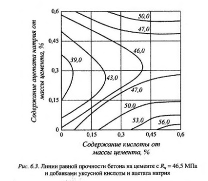 Способность буферных систем поддерживать постоянство значения pH зависит от качественного состава буферной смеси и концентрации ее компонентов. При добавлении к буферному раствору значительных количеств сильной кислоты или сильного основания может наблюдаться резкое изменение pH, т е. буферные системы обладают определенной емкостью. Возможность буферных систем определенное время защищать pH цементной системы от воздействия агрессивной среды явилась основной теоретической предпосылкой, на основании которой нами было рекомендовано применение этих веществ в качестве добавок в бетоны для повышения их физикохимического сопротивления. В этой связи большой интерес вызвали буферные добавки к цементному камню, которые могли бы «смягчить» химическое воз действие на него растворов сильных неорганических кислот небольших концентраций. В качестве основного был принят первый вид буферных систем, который состоит из слабой кислоты и соли, образованной ее взаимодеиствием с сильным основанием, в основном с едким натром. Такой выбор следует объяснять не только меньшей зависимостью этих систем от температуры, но и возможностью получения для затворения цементных материалов сред с pH < 7. Известно, что pH среды оказывает влияние на гидратацию цемента. Причем применяемая для его затворения вода с pH от 3,2 до 1,6 позволяет получать материал с улучшенными физико-химическими и структурными характеристиками. Обогащение воды затворения ионами Н способствует увеличению скорости гидратации цементных материалов, а повышенное содержание гидроксильных ионов приводит к существенному замедлению реакции гидратации. В этой связи мы предположили, что поскольку буферными системами можно изменять как природу, так и pH среды затворения, то можно тем самым добиваться улучшения свойств бетонных смесей и бетонов, в частности повышать прочностные характеристики и физико-химическое сопротивление отвержденного материала. Из рисунка 6.3 видно, что введением ацетатных буферных систем в состав смеси можно на 45-100% увеличить прочность при сжатии цементного бетона, отвержденного с применением тепловлажностной обработки. В то же время было установлено, что повышенный расход добавок приводит к снижению прочности.