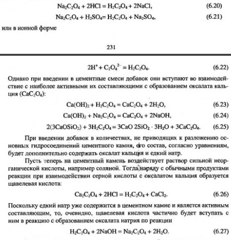 Так, бетон при изготовлении которого вводили 2,4% уксусной кислоты и 2,4% ацетата натрия, имел прочйость при сжатии примерно в 1,5 раза меньше, чем подобная характеристика материала контрольного состава. Значительно повышается сопротивляемость цементных материалов с буферными добавками слабым растворам неорганических кислот. Рассмотрим это влияние на примере цементных композитов с оксалатными буферными системами. При действии растворов соляной и серной кислот на несвязанную оксалатную буферную систему происходят взаимодействия согласно уравнениям: