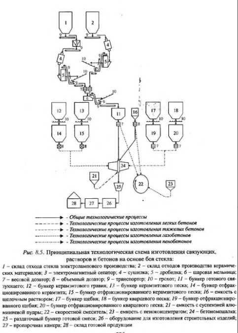 Приготовление бетонных смесейПриготовление бетонных смесей для изготовления ограждающих конструкций на основе каркасного керамзитобетона заключается в дозировании и перемешивании составляющих их материалов. Дозирование компонентов выполняется с точностью, обеспечивающей достижение необходимых проектных свойств бетона. При приготовлении смесей материалы дозируют по массе: связующие, воду и добавки - с точностью до ± 1 %; заполнители - до ± 2%. Для обеспечения такой точности применяется специальное дозаторное оборудование. Выбор вида дозаторов определяется в зависимости от типа смесителей и их компоновки. Наибольшее применение в практике имеют полуавтоматические и автоматические цикличные весовые дозаторы, включающие весовой дозировочный бункер, загрузочное устройство весовой механизм и устройство управления. Дозирование заполнителей и цемента осуществляется по массе. Воду и жидкие добавки можно дозировать по массе и объему При дозировании расхода воды следует учитывать фактическую влажность заполнителей. Бетонные смеси готовят в бетоносмесителях принудительного действия. Большое влияние на качество перемешивания оказывают его продолжительность и порядок подачи составляющих компонентов в бетоносмеситель. При приготовлении легкобетонной крупнопористой смеси материалы загружают в смеситель без его остановки. При полуавтоматическом дозировании сначала подают сухие заполнители (керамзит) и 2/3 требуемого количества воды и производят перемешивание данной смеси в течение 1 мин. Затем подают вяжущее, песок и оставшуюся часть воды с пластифицирующей или газообразующей добавкой и перемешивают в течение 3 мин. Алюминиевую пудру предварительно обрабатывают для удаления жировой пленки, которой она покрывается в процессе изготовления. Для этого ее прокаливают в электропечах при температуре 200 250°С в течение 4 ч. Существует и другой способ добавление поверхностно активных веществ, благодаря чему нейтрализуется гидрофобизирующее действие парафиновом пленки, имеющейся на частицах алюминиевой пудры. Приготовление пенобетонной смеси включает получение технической пены, растворной смеси из вяжущего и кремнеземистого компонента и их смешивание. Пену получают интенсивным смешиванием пенообразователя с водой. Смеси готовят в двухбарабанном пеносмеси геле. В одном барабане из воды и пенообразователя в течение 5 мин приготавливают пену, в другом в течение такого же времени - раствор из вяжущего кремнеземистого компонента и воды. Пену выгружают в барабан с раствором и смесь перемешивают не менее 2 мин. На следующем этапе отдозированное количество предварительно подготовленных стеклобоя, минеральной добавки и активизатора твердения (полуводного гипса) подвергаются дополнительному совместному помолу, а затем подаются в бункер готового связующего. Оптимальная очередность подачи компонентов в работающий смеситель следующая: связующее предварительно перемешивается с заполнителями в сухом состоянии. Затворение сухой смеси осуществляется концентрированным щелочным раствором (оптимальное количество щелочи растворяется в незначительном количестве воды). Необходимая величина подвижности достигается за счет дополнительного введения воды. При изготовлении газобетонов в состав затворенной щелочным раствором 