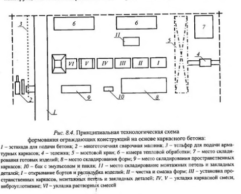 К основным относят приготовление бетонной смеси, включая подготовку составляющих материалов; изготовление арматурных элементов и готовых каркасов, формование изделий; тепловую обработку отформованных изделий, освобождение готовых изделий из форм и подготовку форм к очередному циклу. Вспомогательные операции: получение и подача пара и воды, сжатого воздуха, электроэнергии, складирование сырьевых материалов, полуфабрикатов и готовой продукции, пооперационный контроль и контроль качества готовой продукции, необходимые для выполнения основных операций. К транспортным относят операции по перемещению материалов, полуфабрикатов и изделий. Технологический процесс изготовления изделий на заводах сборного железобетона организуется агрегатно-поточным способом в перемещаемых формах, который отличается большой гибкостью и маневренностью в использовании технологического и транспортного оборудования. При такой организации технологический процесс изготовления ограждающих конструкций на основе каркасного керамзитобетона состоит из отдельных операций, выполняемых на определенных рабочих постах, и включает в себя следующий комплекс работ очистка формы и оснастки от цементной пленки и раствора, сборка разъемной формы, смазка рабочей емкости формы, укладка в форму арматурных каркасов и закладных деталей; подача формы на формовочный пост; укладка в форму бетонной смеси и ее вибрирование; укладка растворной смеси и ее уплотнение; подача изделия в форме в камеру тепловой обработки; тепловая обработка изделия; извлечение формы с изделием из камеры и передача ее на пост распалубки; распалубка и охлаждение изделия; приемка изделия отделом технического контроля; транспортирование на склад готовой продукции. При этом часть операций выполняется одновременно. Принципиальная технологическая схема изготовления ограждающих конструкций на основе каркасного бетона представлена на рис. 8.4.