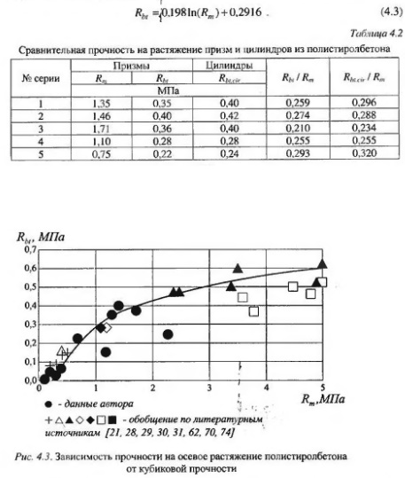 Учитывая большой разброс экспериментальных данных, связанный в первую очередь с отработкой оптимальных составов, предложенная зависимость позволяет определять необходимую для расчета по образованию трещин прочность полистиролбетона на осевое растяжение, используя значение кубиковой прочности. |
