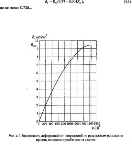 Повышенную относительную призменную прочность полистиролбетона можно объяснить в первую очередь следствием повышенной его растяжимости по сравнению с другими видами бетонов. Поскольку разрушение бетонных призм происходит из-за образования и раскрытия продольных трещин, т.е от поперечного растяжения, повышение растяжимости бетона сильнее скажется на результатах испытания призм, чем кубов. Повышенная способность деформироваться при поперечном растяжении полистиролбетона подтверждается определением коэффициента поперечных деформаций, которьй составляет 0,22.. 0,28, что выше, чем у друг их легких бетонов. Относительная предельная сжимаемость полистиролбетона достигает 210 без учета нисходящей ветви диаграммы.
